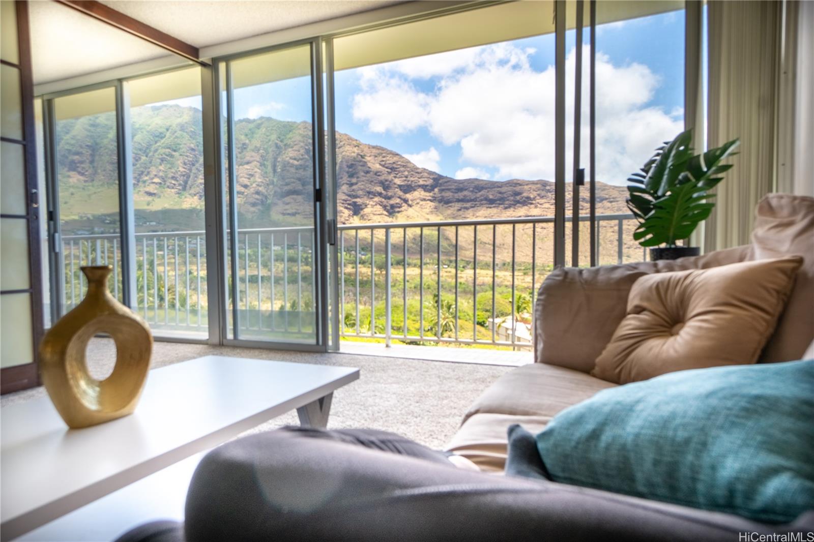 Awesome view of the valley, mountain and coastline from the living room and master bedroom is the best feature for this unit. Relax and watch a spectacular sunset from this, secure gated community with 24 hours security. Walking distance to the bus stop and the beautiful Makaha beach. Full renovations include cabinetry, flooring, bath and kitchen with all new appliances. Maintenance fee includes electric, water, sewer, and basic cable. The Association offers BBQ area and pool.