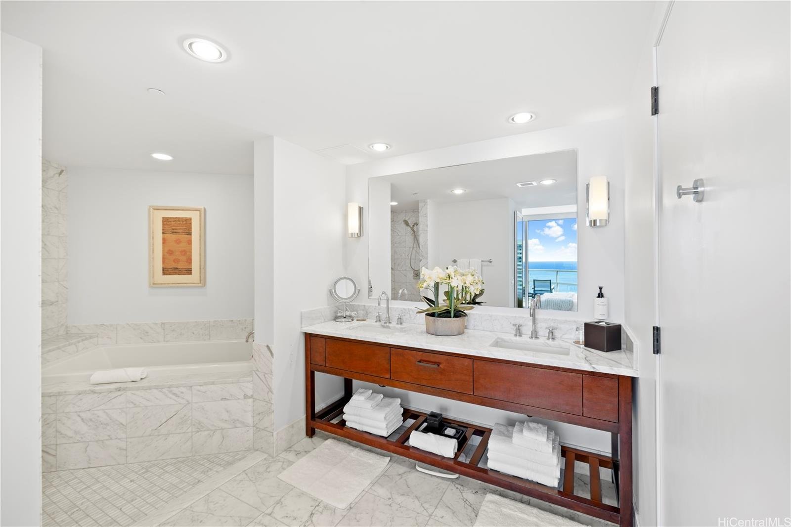 Just minutes from Waikiki Beach, this elegantly upgraded corner unit offers true resort-style living. Enjoy convenient access to a wide variety of nearby restaurants, as well as on-site dining and room-service options available through the hotel. Take in sweeping panoramic views of the city skyline framed by the mountains, Koko Crater and Koko Head in Hawaii Kai, Diamond Head, and the iconic Pink Palace with Waikiki Beach as its backdrop. Relax on two separate lanais: one off the primary bedroom facing the ocean and the other off the living-dining area with beautiful mountain views. The residence features a well-equipped kitchen, generously sized bathrooms, ample storage—including a walk-in closet in the primary bedroom—and thoughtful details throughout. Recent updates include brand-new engineered hardwood floors, adding a gentle sense of warmth and comfort throughout the home. It is a place that truly soothes the heart, reminding you how important the floor can be. New modern roller shades are designed to maximize the stunning 180-degree views unique to this corner unit. Experience luxury island living at its finest.