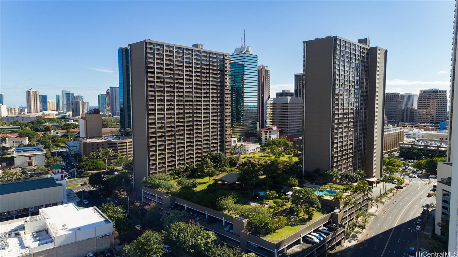 Kukui Plaza, a condo in Downtown Honolulu, comprises two towers - Ewa and Diamond Head - linked by a garage roof transformed into a private park featuring a large fish pond, covered picnic area, walking/jogging path, trees, and expansive grassy spaces, ideal for relaxation or gatherings.