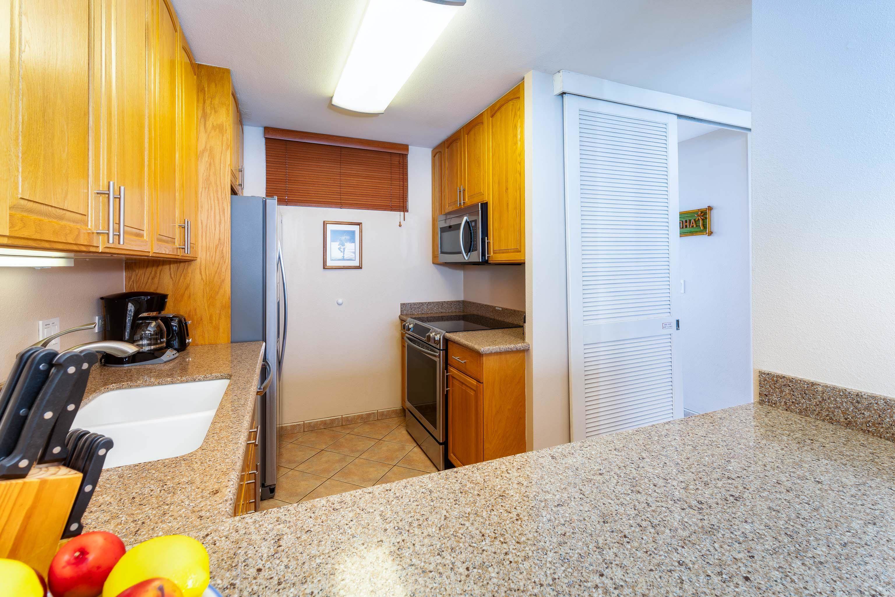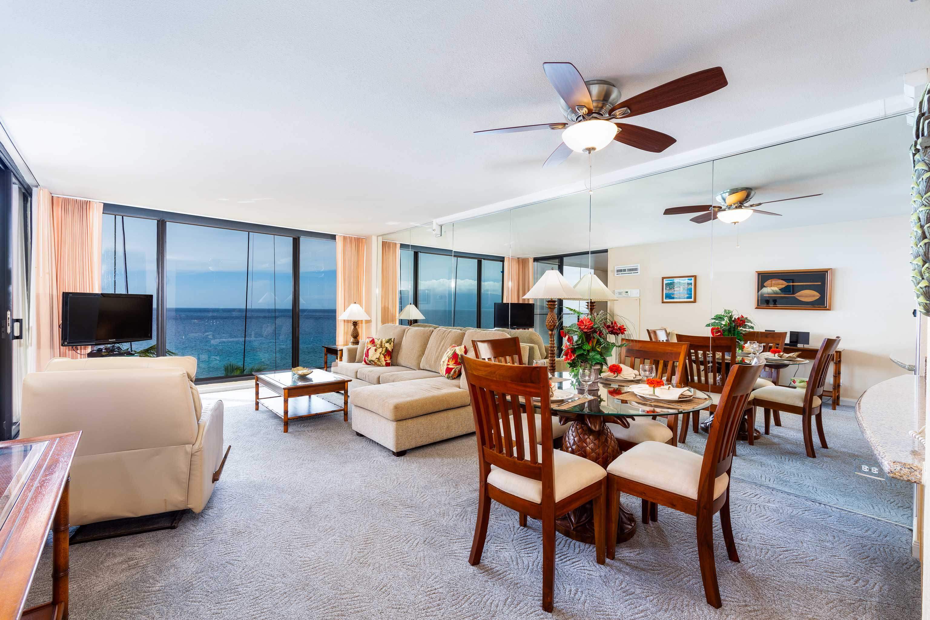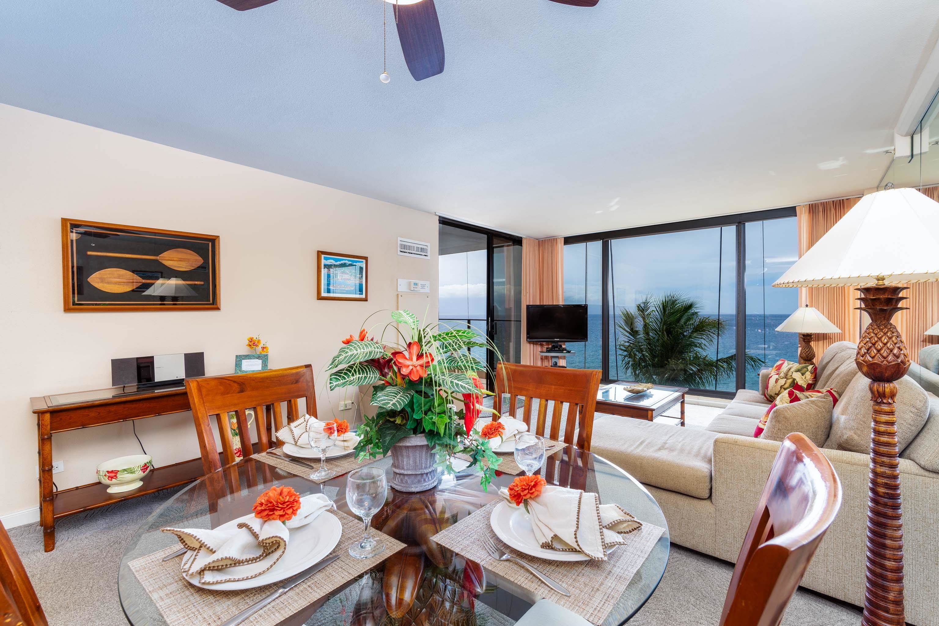 Fantastic 8th floor location at the Mahana in the Lanai Wing. Beach front living at its best with unobstructed Ocean View's with the majestic islands of Lanai and Molokai as a back drop. Tastefully furnished and with a remodeled kitchen with quartz counter tops and wood cabinets. Imagine sitting on your covered lanai and enjoying the spectacular ocean views and having a front row seat for watching the humpbacks whales in the Winter. Mahana at Kaanapali offers a quiet resort getaway under the shade of the monkey pod tree's. Amenities include an oceanfront swimming pool, hot tub, BBQ grilling facilities and shuffle board plus tennis courts. Nearby there are numerous shops and restaurants including Dukes located along the boardwalk. Current assessment for the on going spalling work and future roof replacement at the property will start in April 2022 at a cost of an additional $1,136.11 per month for 60 months.