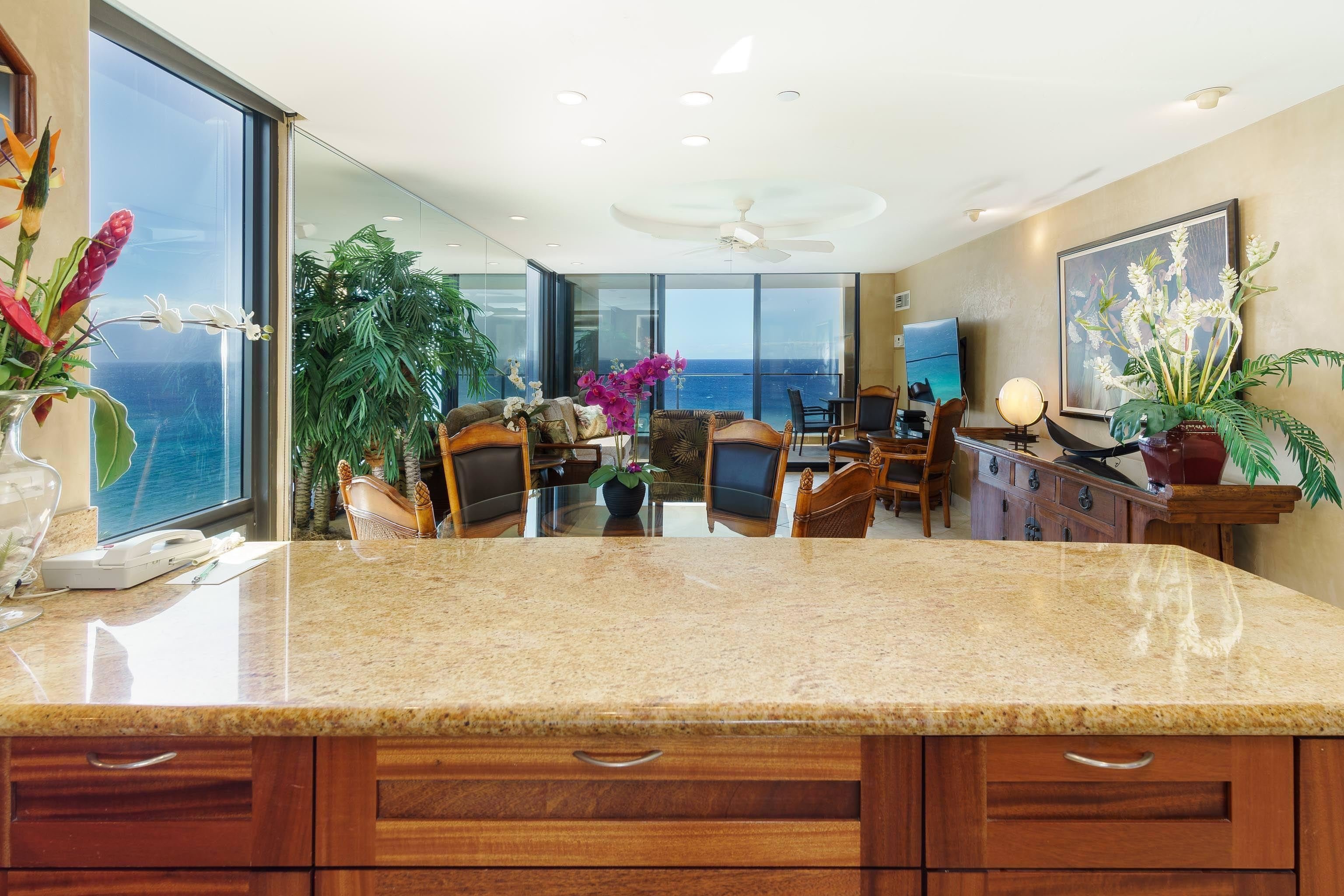 Beachfront living at its absolute best! Mahana 901 is positioned in one of the most desirable locations within the property on the South corner of the Molokai Tower. Enjoy year round sunsets and a front row seats for watching the Humpback Whales in season. Beautifully remodeled two bedroom two bath with amazing ocean views from your private lanai, living room, kitchen and master bedroom plus the majestic West Maui mountain views from the second bedroom. Sophisticated and elegant are words that come to mind when viewing Mahana 901. Renovated to the highest standards with porcelain tiled floors throughout, granite counter tops, African Mahogany cabinets and Merbau wood interior doors and trim. Unit 901 is in the front desk Aston Resort Quest vacation program. Mahana at Kaanapali offers a quiet resort getaway under the shade of the Monkey Pod trees. Amenities include an oceanfront swimming pool, hot tub, grilling facilities, shuffle board and tennis courts. There is also access to the 3 mile stretch of boardwalk that connects several Kaanapali Resorts that offer dining and shopping nearby.