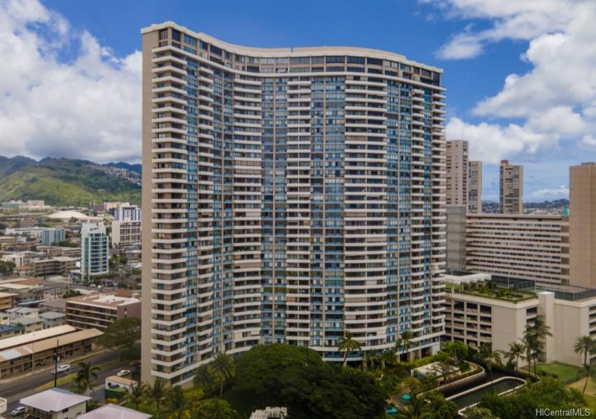 Marco Polo Apartments is a high-rise condo on Kapiolani Blvd near Waikiki, known for its wave-like design where several units boast canal views and some higher floor units great ocean views.