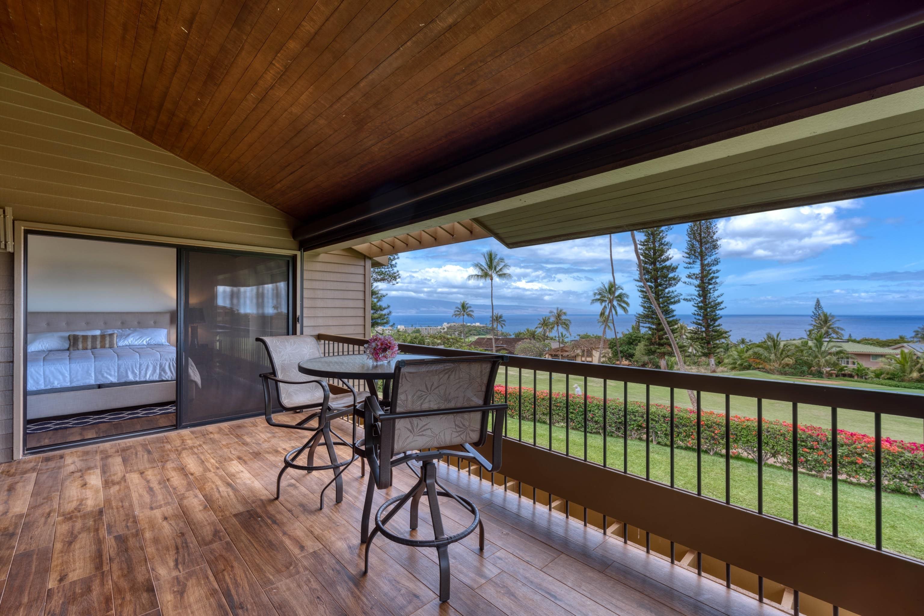 Amazing front row 2-bedroom 2-bath Masters condo with outstanding ocean views centered between the neighbor islands of Lana'i and Moloka'i. Top floor unit overlooking the 13th green of the Kaanapali Golf Course. Picture perfect sunset views, and a prime spot for watching Maui's humpback whales in winter. Completely remodeled in 2014 with porcelain wood tile throughout, a custom kitchen with a 13-foot granite counter, custom cabinetry and stainless steel appliances. Master bathroom features a spacious roll-in shower with dual showers and stand alone soaking tub under the skylight. Extensive built-in cabinetry in master suite, walk-in closet, Grohe fixtures, Minka ceiling fans, LED lighting with smartphone controls, motorized lanai blinds, and solar shades. Being sold furnished. Masters is an impeccably maintained gated community in the Kaanapali Hillside sprawling over 37 acres of beautifully landscaped grounds, with two swimming pools and tennis courts. VACANT AND EASY TO SHOW.