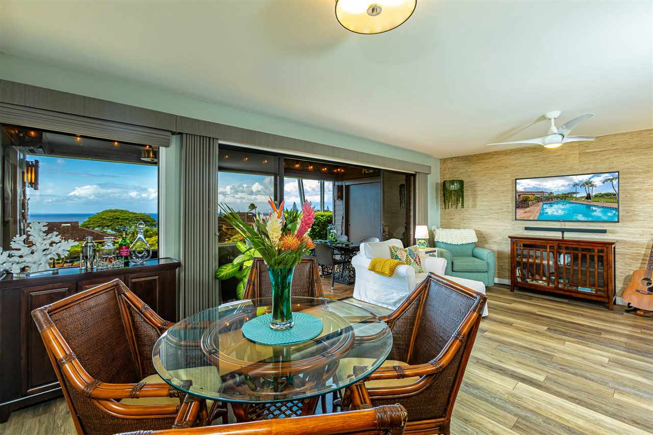 I dare say that it does not get any better than this at ‘The Masters’. You will enjoy mesmerizing unobstructed panoramic Ocean & Outer Island views from South of the Island of Lanai & all across Lahaina & Kaanapali. Upon entering this renovated unit you find a gallery-like art-filled corridor with recessed lighting & wood-like porcelain tiled floors that culminates with an ‘Oh My G-d’ view of the blue pacific. The large open living room offers oversized comfy chairs & exudes a feeling of warmth! Be inspired & indulge your inner chef while creating your culinary masterpiece in the gorgeous kitchen which boasts specimen granite counters, elegant white cabinetry, a full-height marble & glass backsplash, a Blanco sink, along with a Fisher-Paykel stainless steel fridge. Unusual for a 923 s.f., 1 bedroom, 1 bath unit is the large walk-in kitchen pantry/laundry. The bright & modern en-suite bath features a white/caramel granite counter with a lovely glass tile backsplash, a glassed-in shower with floor to ceiling large-scale tiles & a glass tile accent. The spacious master suite has lovely views into the lush gardens & two closets with double-mirrored sliders. There are ceiling fans in the living room & bedroom plus split-system air conditioning. The large ocean view tiled lanai accommodates a BBQ, & has a large lockable storage closet. The gated Masters at the World Class Kaanapali Hillside has numerous pools, tennis courts & beautiful mature landscaping. Recent numerous exterior upgrades to all buildings included new roofs! It will be difficult not to fall in love with this prime location in this premium complex.