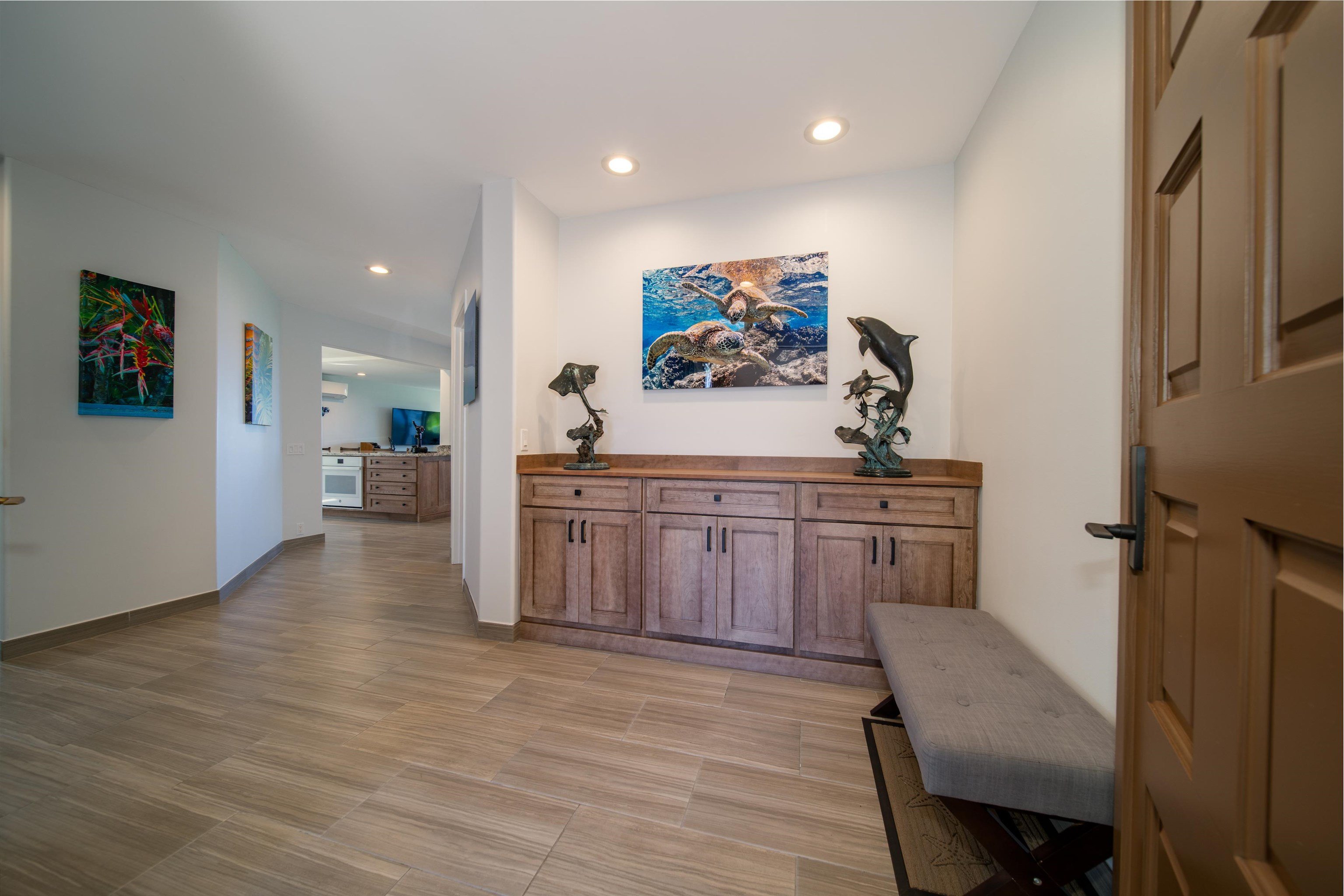 Welcome to The Masters #905! The Masters at Kaanapali Hillside is a long-time favorite community among those looking for luxury living. This exquisite condo has unobstructed panoramic ocean views and overlooks the 13th fairway of the world renowned Kaanapali Golf Course. The pride of ownership shines in this ground floor, 2-bedroom 2 bath + den unit that has been fully remodeled in 2022. Porcelain tile flooring throughout extends out to the large, covered lanai – perfect for dining, entertaining and in-season whale watching. This is the largest ground floor corner unit which offers extra windows to maximize the natural light & privacy. The kitchen has been appointed with custom hardwood cabinetry, granite countertops, new GE & Kitchen-Aid appliances. The large peninsula offers great counterspace and comfortable bar seating for five. The spa-like walk in showers in both bathrooms feature pebble tiles and over-head rain shower heads. No detail has been left untouched including brand new Milgard double pane sliding doors & windows throughout, recessed can lighting, an Eco-Smart on Demand water system, 3 Daikin split AC units & ceiling fans in each room for the utmost efficiency and comfort. Enjoy the privacy of this 27-acre community while being moments away from Maui’s infamous beaches, shopping, and dining. This residential condo is pet-friendly and offers the ultimate Maui lifestyle with amenities that include 2 swimming pools, tennis/pickleball courts throughout the community.