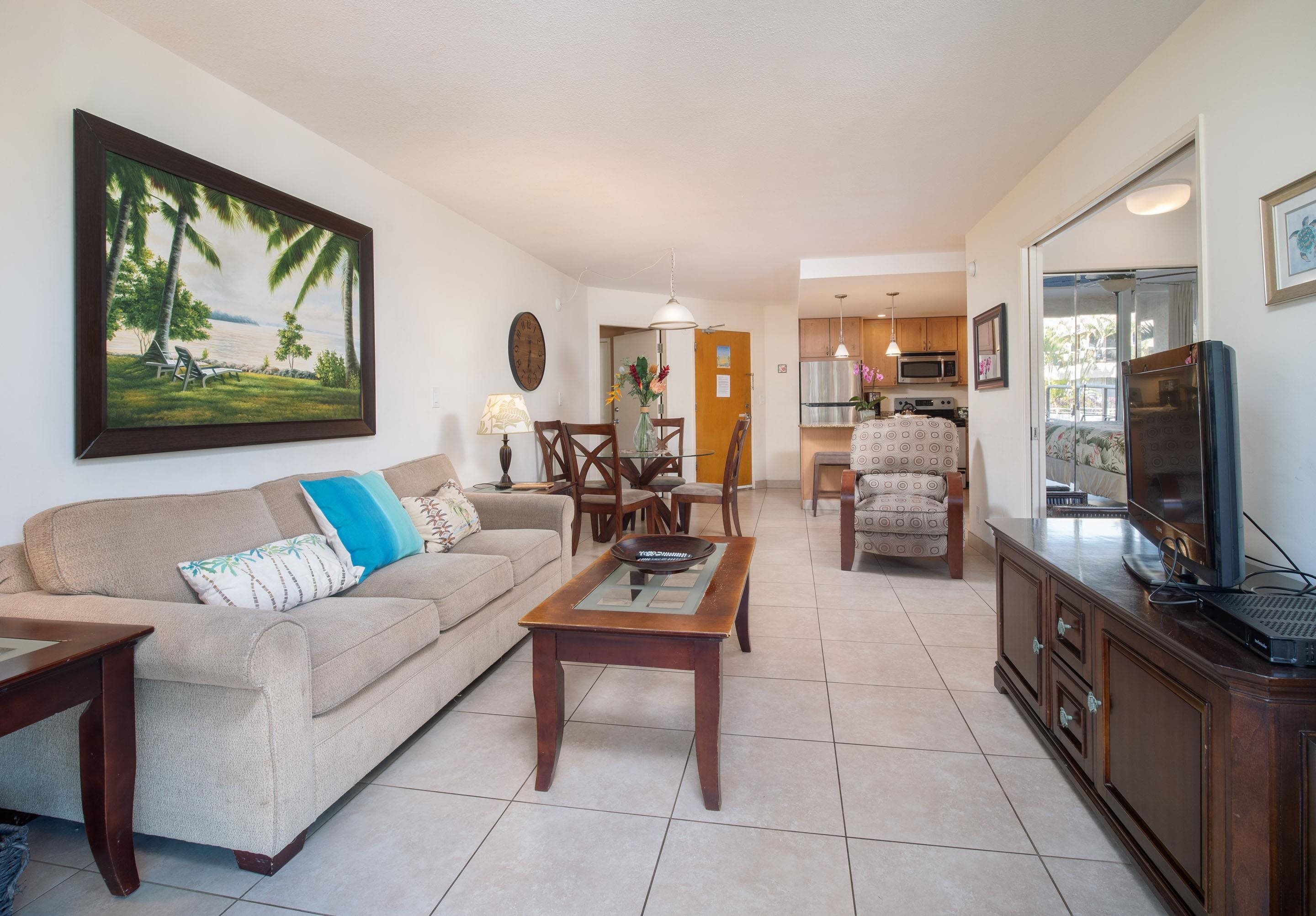 Located in the heart of Kihei, Maui Banyan is a well-maintained condominium complex with a resort-style atmosphere. It is not oceanfront, but the beautiful Kamaole Beach Park II is right across the street.