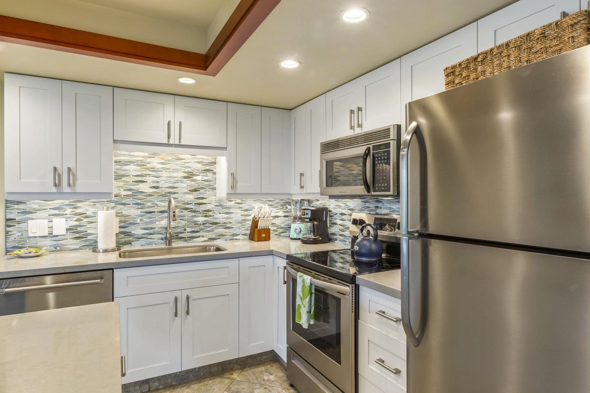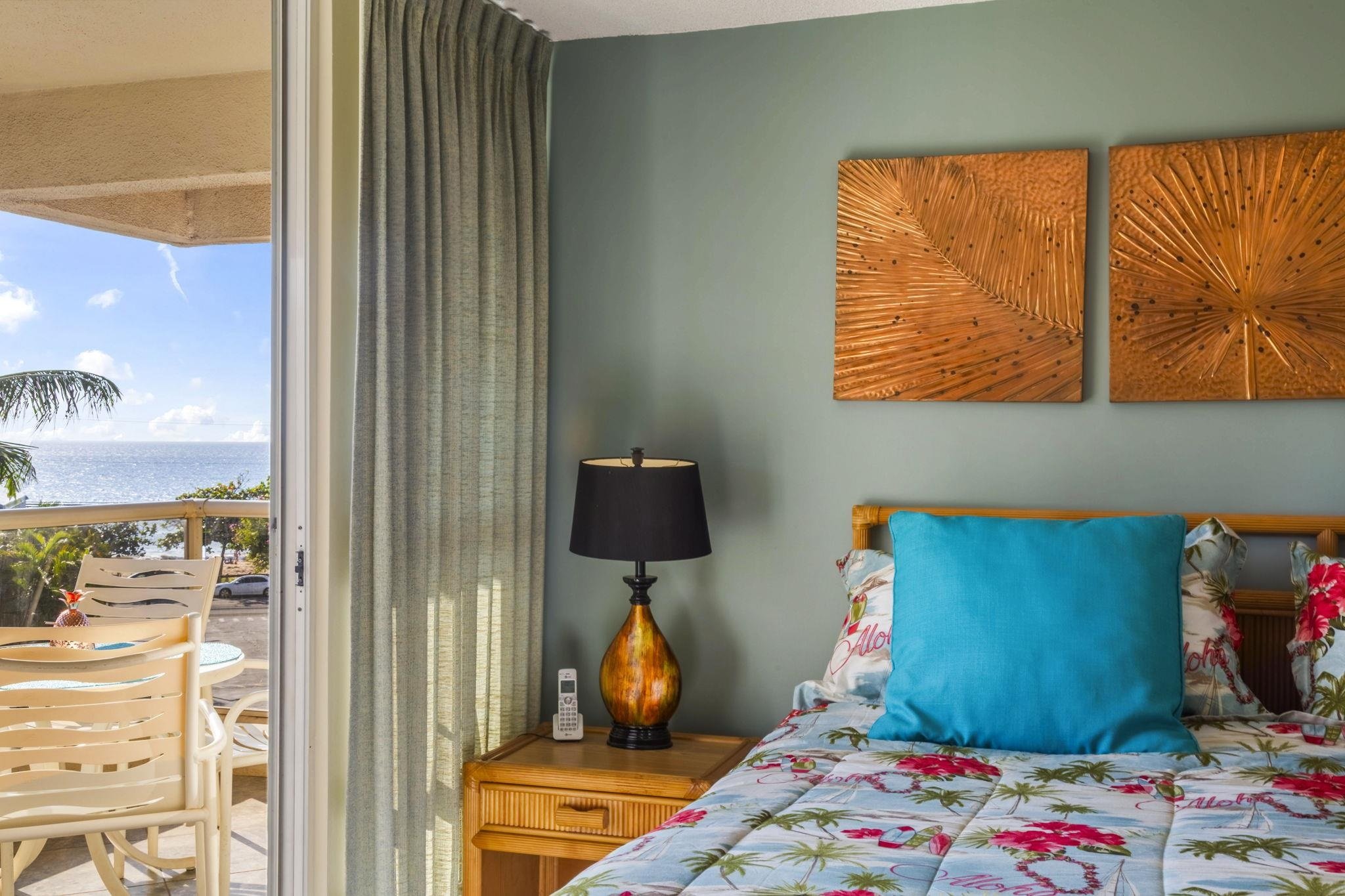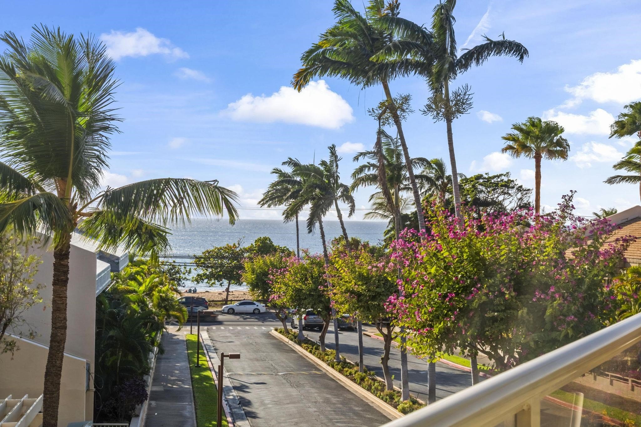 Maui Banyan G201 has not been on the market since 1997. A two-bedroom and two-bath end unit sits at the front of the building, with direct ocean views of Kamaole II Beach. Renovated in late 2022, this unit welcomes you with inlaid petroglyph honu's on the entry tile, a fully renovated kitchen showing off a stunning backsplash, quartz counter, and an eat-at-island. Both bathrooms have been renovated and feature a river rock shower floor. New beds were purchased during the renovation, and a new stack washer & dryer recently. Fully furnished, turn-key ready, and well-kept, this unit is primed to welcome you home or your vacation rental guests to start their holiday. The sandy Kamaole II Beach awaits your arrival to sink your toes in the sand, exhale, and dip in the ocean. Some of Maui's frequented restaurants and shops are within minutes from your front door. This property is H-2 Hotel zoned and is currently in a short-term rental program. Call your favorite realtor for a showing.