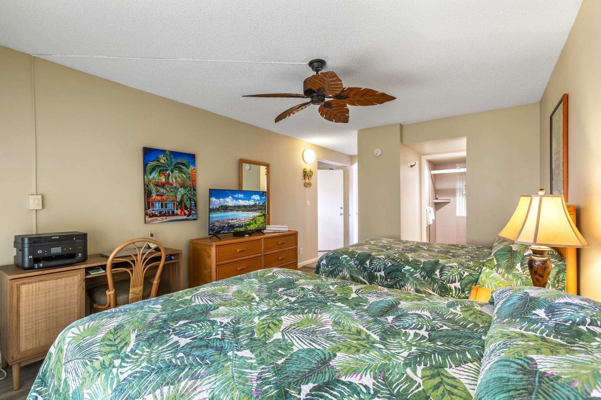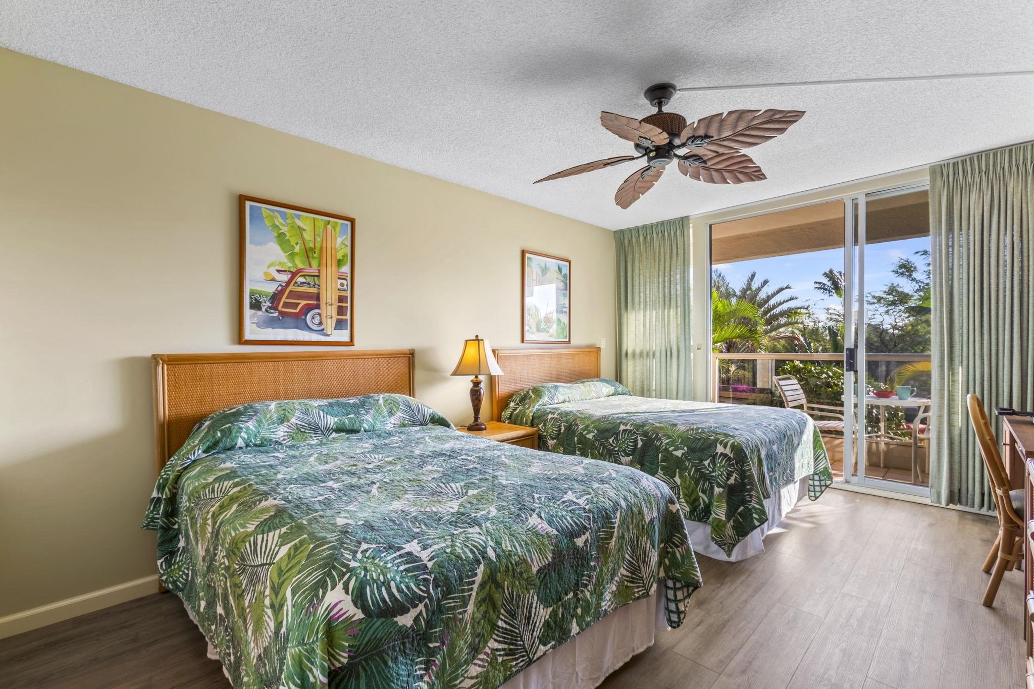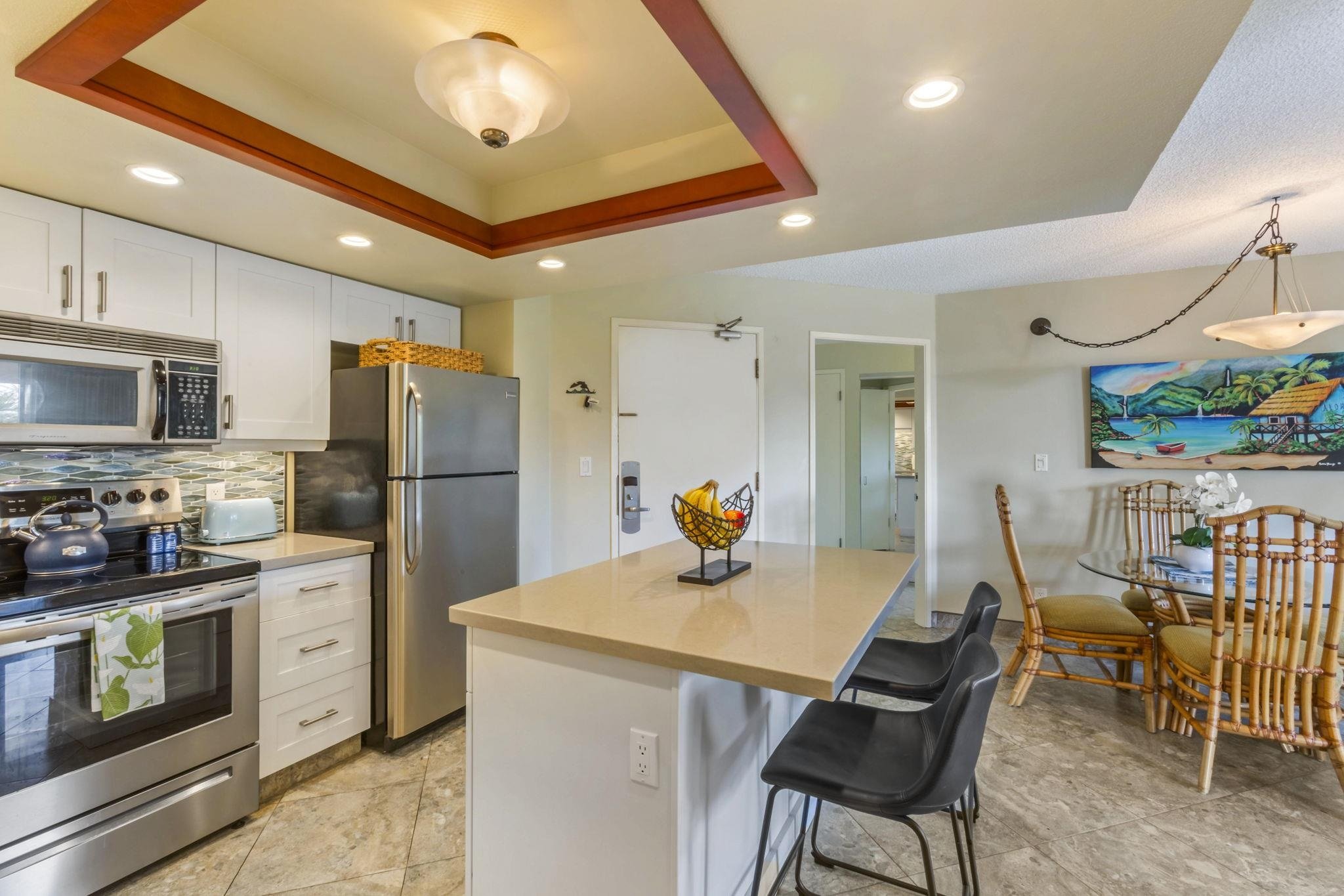 Maui Banyan G201 has not been on the market since 1997. A two-bedroom and two-bath end unit sits at the front of the building, with direct ocean views of Kamaole II Beach. Renovated in late 2022, this unit welcomes you with inlaid petroglyph honu's on the entry tile, a fully renovated kitchen showing off a stunning backsplash, quartz counter, and an eat-at-island. Both bathrooms have been renovated and feature a river rock shower floor. New beds were purchased during the renovation, and a new stack washer & dryer recently. Fully furnished, turn-key ready, and well-kept, this unit is primed to welcome you home or your vacation rental guests to start their holiday. The sandy Kamaole II Beach awaits your arrival to sink your toes in the sand, exhale, and dip in the ocean. Some of Maui's frequented restaurants and shops are within minutes from your front door. This property is H-2 Hotel zoned and is currently in a short-term rental program. Call your favorite realtor for a showing.