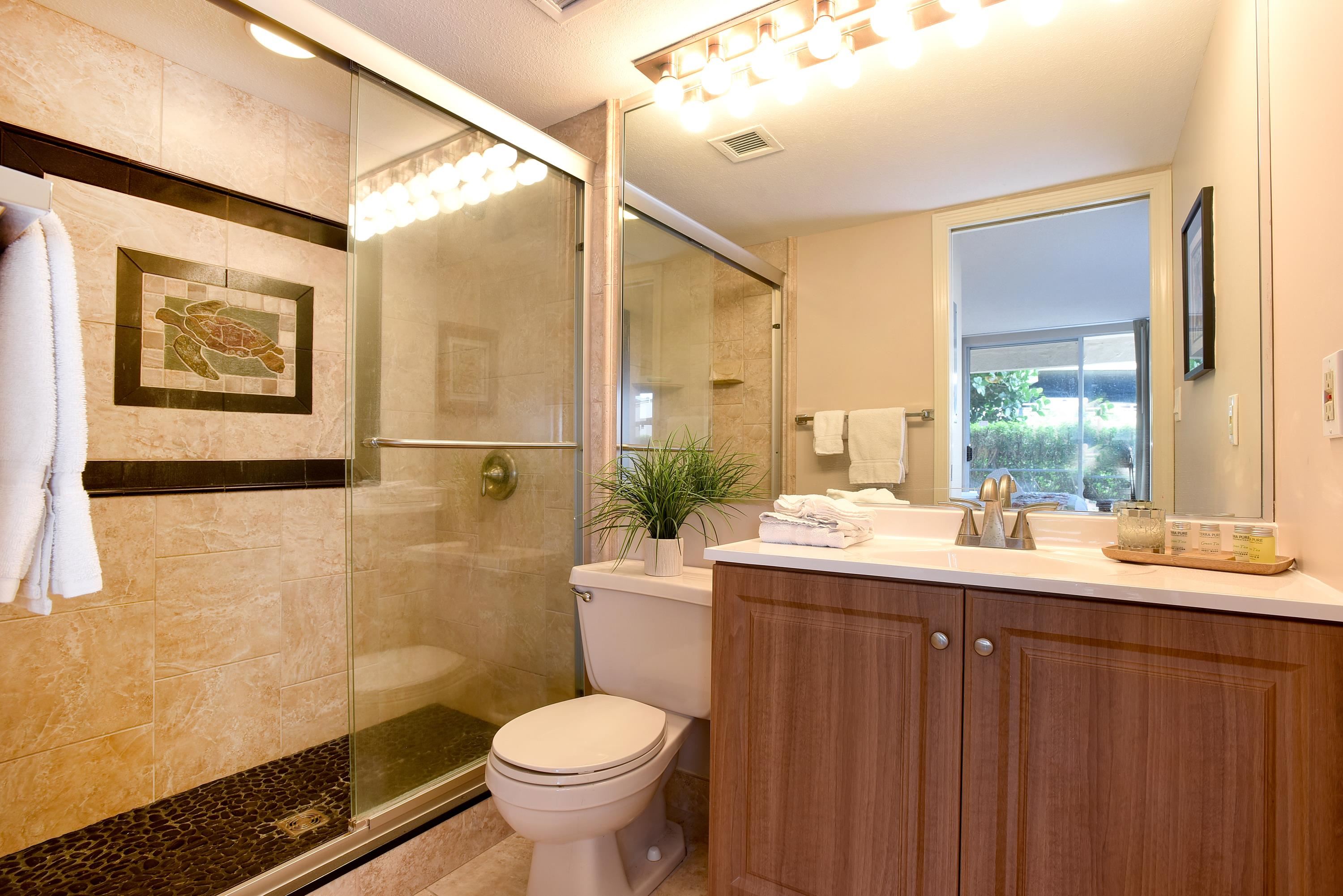 This lovely remodeled unit sits directly across the street from Kamaole Beach II, one of the best beaches on Maui. And it’s within easy walking distance to restaurants and shopping. The unit features ceramic tile throughout, custom designed showers, granite countertops, and beautiful wall art. Maui Banyan has two pools, tennis court, BBQ areas, and a very convenient parking garage. This easily accessible ground floor unit has two full baths and can comfortable accommodate 4 guests