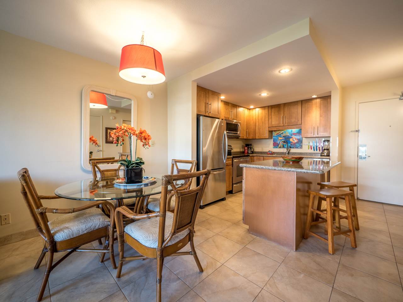 Located directly across the street from Kamaole II Beach, this turnkey condominium is highly desirable to those in search of the ideal Hawai’ian vacation rental! In addition to being just minutes away from the sand, Maui Banyan features two swimming pools and spas, plus parking garage, tennis courts, and Bar-B-Que areas. For your added convenience and fun, Maui Banyan is a short distance to numerous shopping and dining options. Remodeled in 2011, this unit has been updated with new appliances (including the dishwasher, which was installed in 2014), porcelain tile, quartz countertops, and hardwood cabinets in the kitchen and the bathroom, new artwork, and fresh paint throughout. A full-sized washing machine was added in 2016. With two full bathrooms, this lovely unit can comfortably accommodate up to four people. Additional amenities include new flat-screen television in the living room and bedroom. The AC was recently replaced with a new 12,000 BTU Danby unit. Particularly important for older guests, the first-floor location allows easy access when bringing luggage and groceries through the east end of building H, without having to climb stairs or get into an elevator (Maui Banyan has two elevators - one is shared by the G and H buildings and the other by the P and Q buildings). This unit is located on the north side of the building, which significantly reduces air conditioning costs. In addition, it comes with a ground-level covered space in the parking garage.