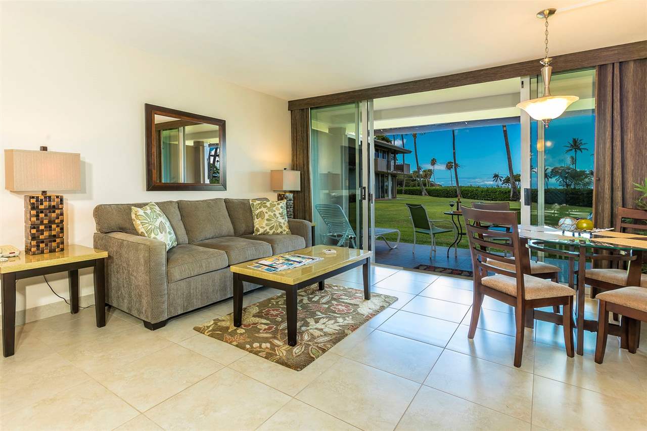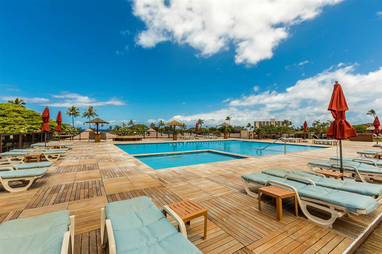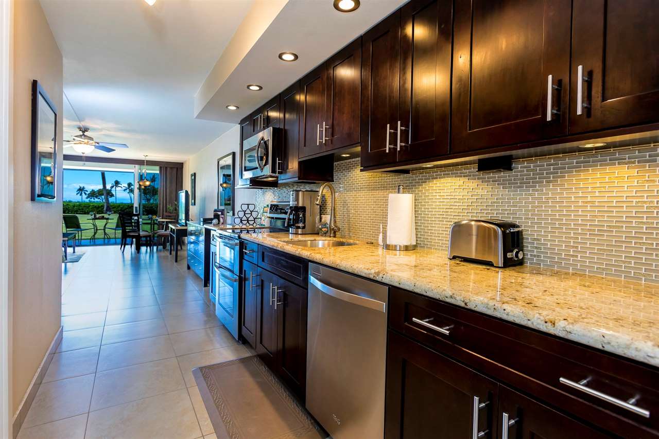 Definitely one of the best locations for a ground floor Studio at Maui Eldorado. Located in the J Building with a center view of the ocean across the golf course and conveniently situated on the ground level with a large extended green belt area in front provides the best natural environment possible. And that’s just the outside. This condo has been extensively remodeled and with every upgrade thinkable and décor that equals the great surroundings. The unit is tiled throughout with an extra large Kitchen including cherry cabinets, Granite counter tops with all Stainless Steel appliances including a Double Door range, Dishwasher, Refrigerator and upgraded Washer and Dryer. There are many custom features but simply put if you were going to design your perfect Condo this would be it. Fully furnished including a sofa sleeper couch, New Lanai door wall, central Air conditioning and there is even an electric outdoor grill. The Studios at Maui Eldorado are an extra large floor plan with 570 square feet with an additional 92 square feet of covered lanai space. The property offers abundant parking including a covered Parking Garage, Three Swimming pools, large recreational deck with Big Ocean views, BarbQue Grills and Shuffle Board, Fully equipped Gym, Front Desk, Concierge, a Convenience Store and continuous Golf cart shuttles to one of the best attractions in Kaanapali, the Cabana on the Beach. Many consider this the best exclusive Condo Resort in Kaanapali with all the amenities on a sprawling 10 acre parcel adjacent to the Golf Course and a short walking distance to all that the Kaanapali Beachwalk has to offer. Monthly AOAO fees cover all expenses with Air Conditioning, Electric, Cable, Internet and Cable all included. Put this one on your list…