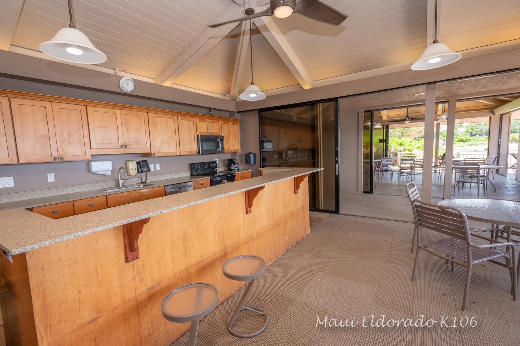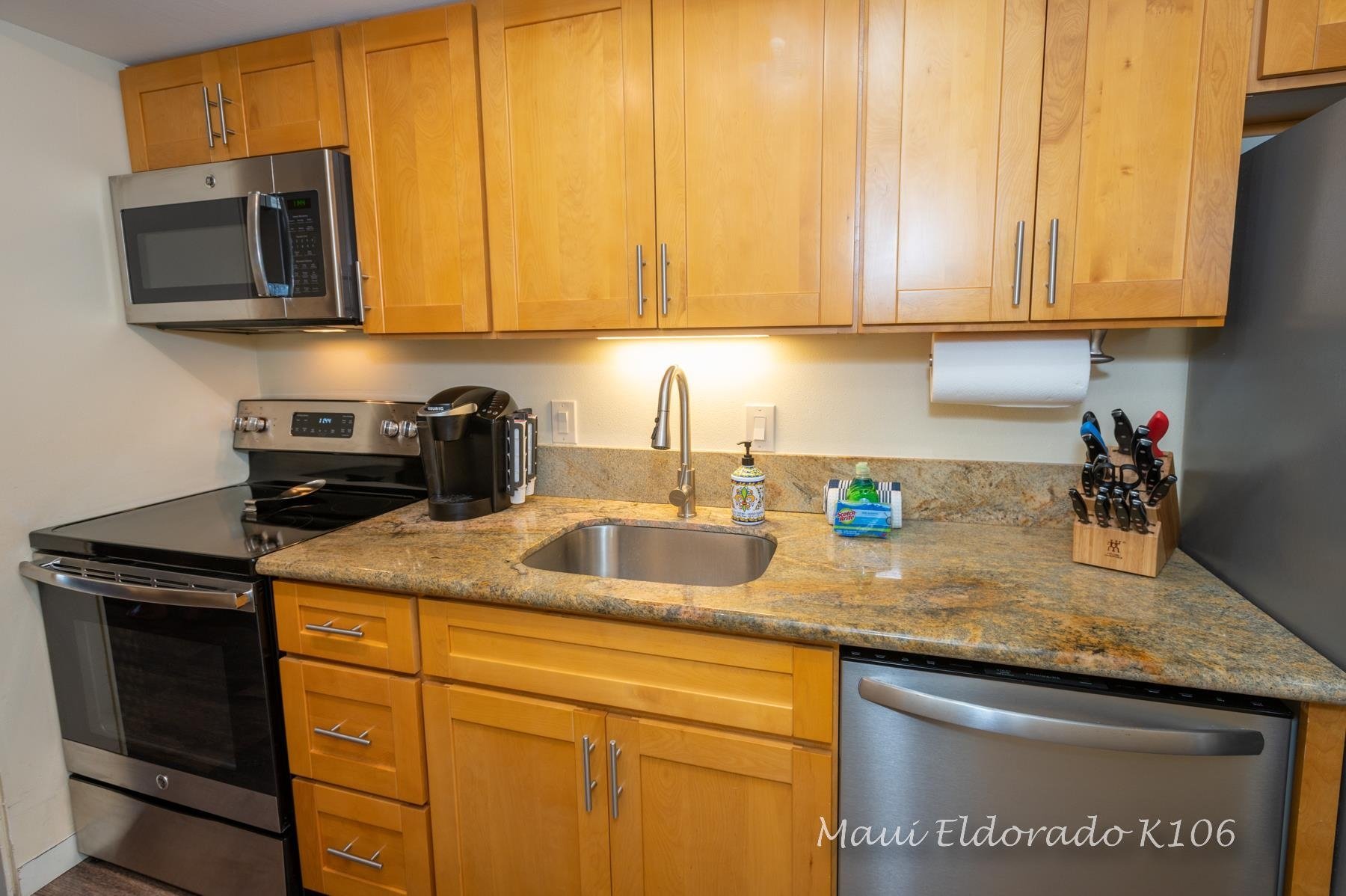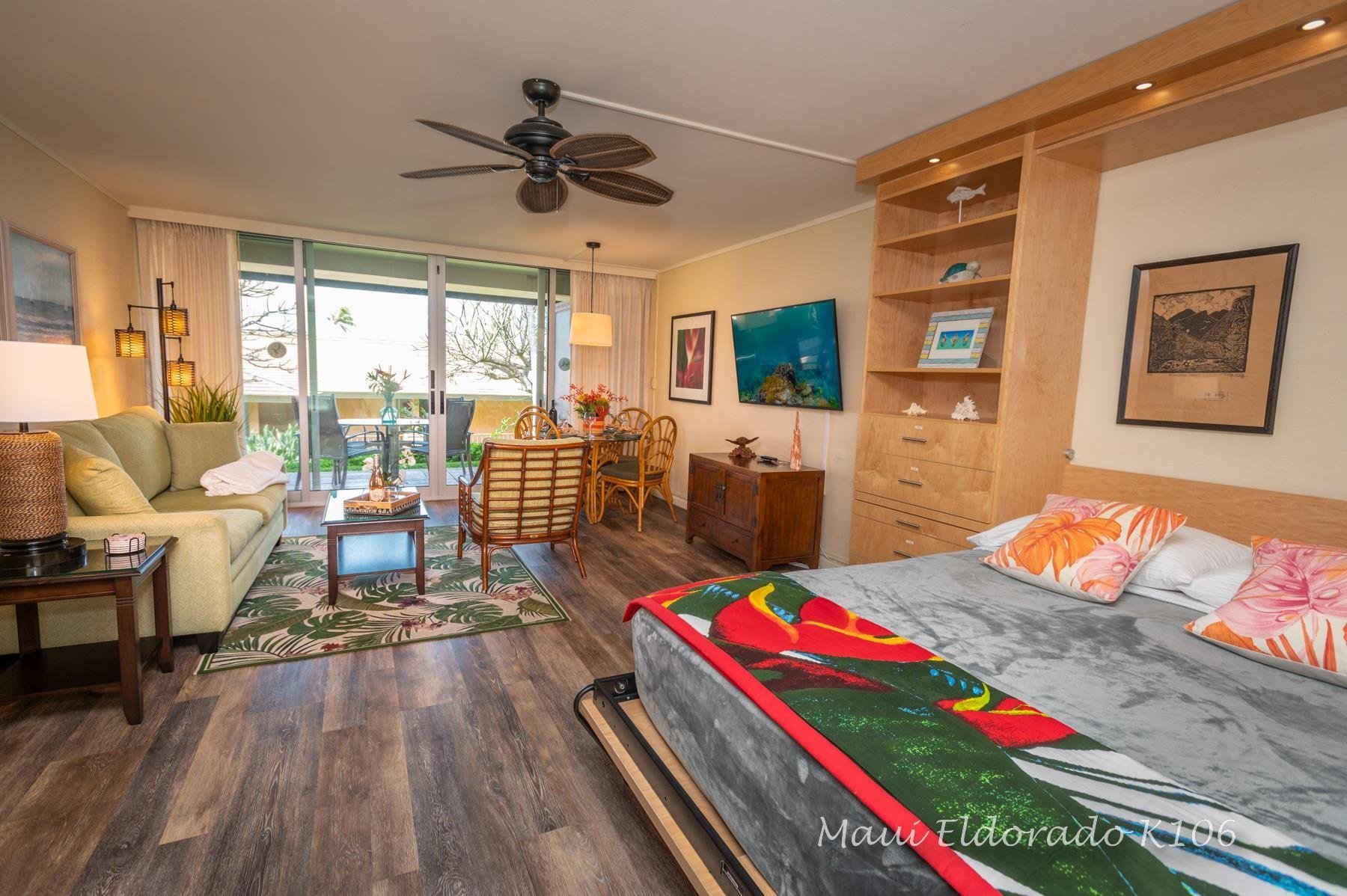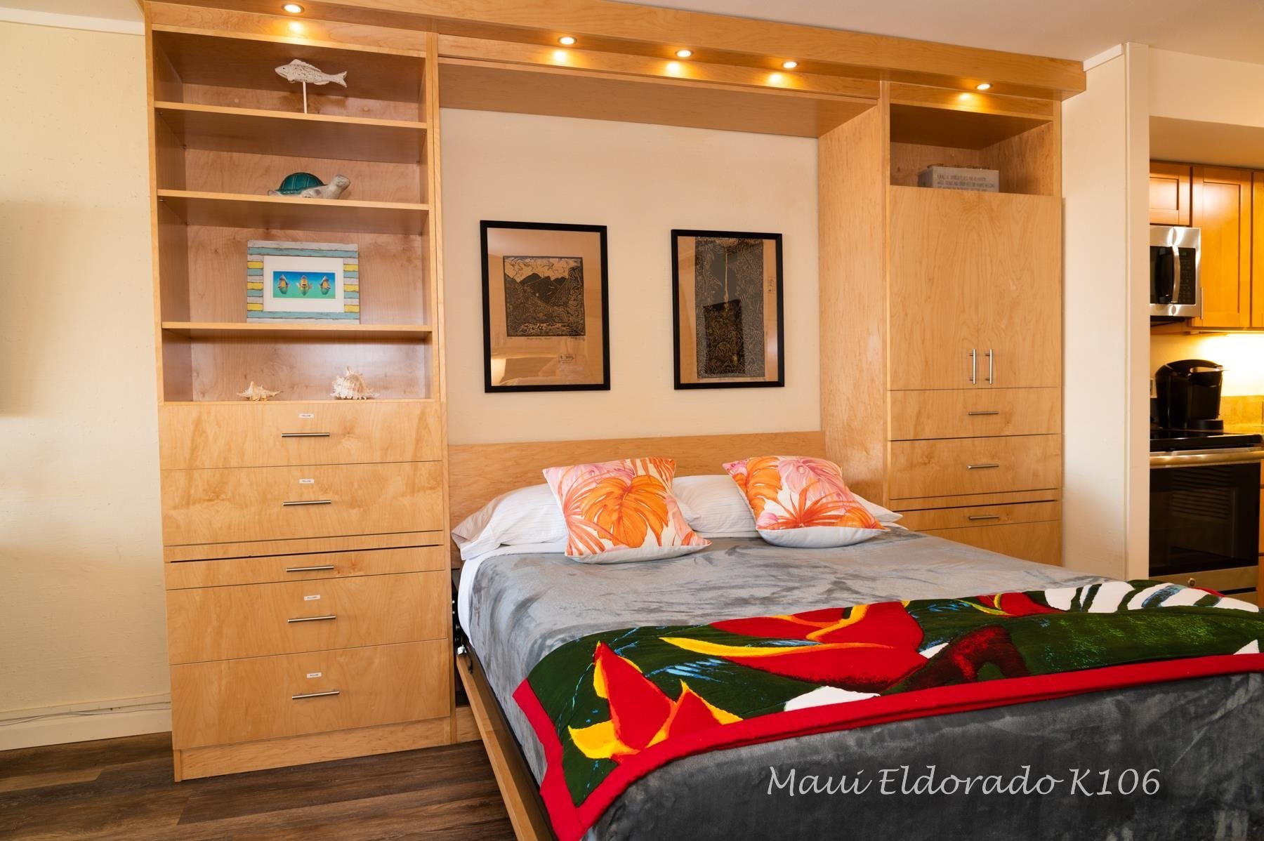 Your turnkey experience at iconic Kaanapali Beach awaits you! This lovely upgraded and updated studio unit at the Maui Eldorado offers a carefree lifestyle in beautiful West Maui or an investment opportunity or both! A kitchen and bathroom renovation was accomplished just a few years ago with granite countertops, stainless steel appliances and gorgeous Cherry Wood Shaker style cabinets throughout. A stylish Murphy bed complements the living space, offering a cozy sleeping area with lots of storage on either side and convenient pull-out night tables. Rounding out the space is an efficient and beautiful desk area, allowing residents and visitors alike their own private space. Other upgrades to this unit include recent replacement of the sliding door unit with an updated unit at a cost of more than $16,000, waterproof and easy to care for vinyl plank flooring, and a dedicated storage closet on the lanai. The condo is being offered fully furnished, including all kitchen appliances, washer/dryer, Murphy Bed, desk unit and seating, dining and lanai furnishings. Recent upgrades total more than $40,000 spent on this fabulous unit. The Maui Eldorado complex offers deluxe living in the heart of Kaanapali Beach. It's close to some of Maui's best shopping and dining as well as famous Kaanapali Beach. Sporting opportunities abound, with tennis, pickleball, hiking and water sports nearby. Included in the monthly maintenance fee are water, cable TV, high speed internet, central air-conditioning, parking garage, 24-hour security, building insurance, sewer, trash and lobby mail service. Maui Eldorado boasts a unique and private beachside Cabana for the exclusive use of owners and guests. Other amenities include pools and hot tub, gas barbque grills, fitness center and shuffleboard. Don't delay viewing this attractively priced unit today! This is a leasehold property.
