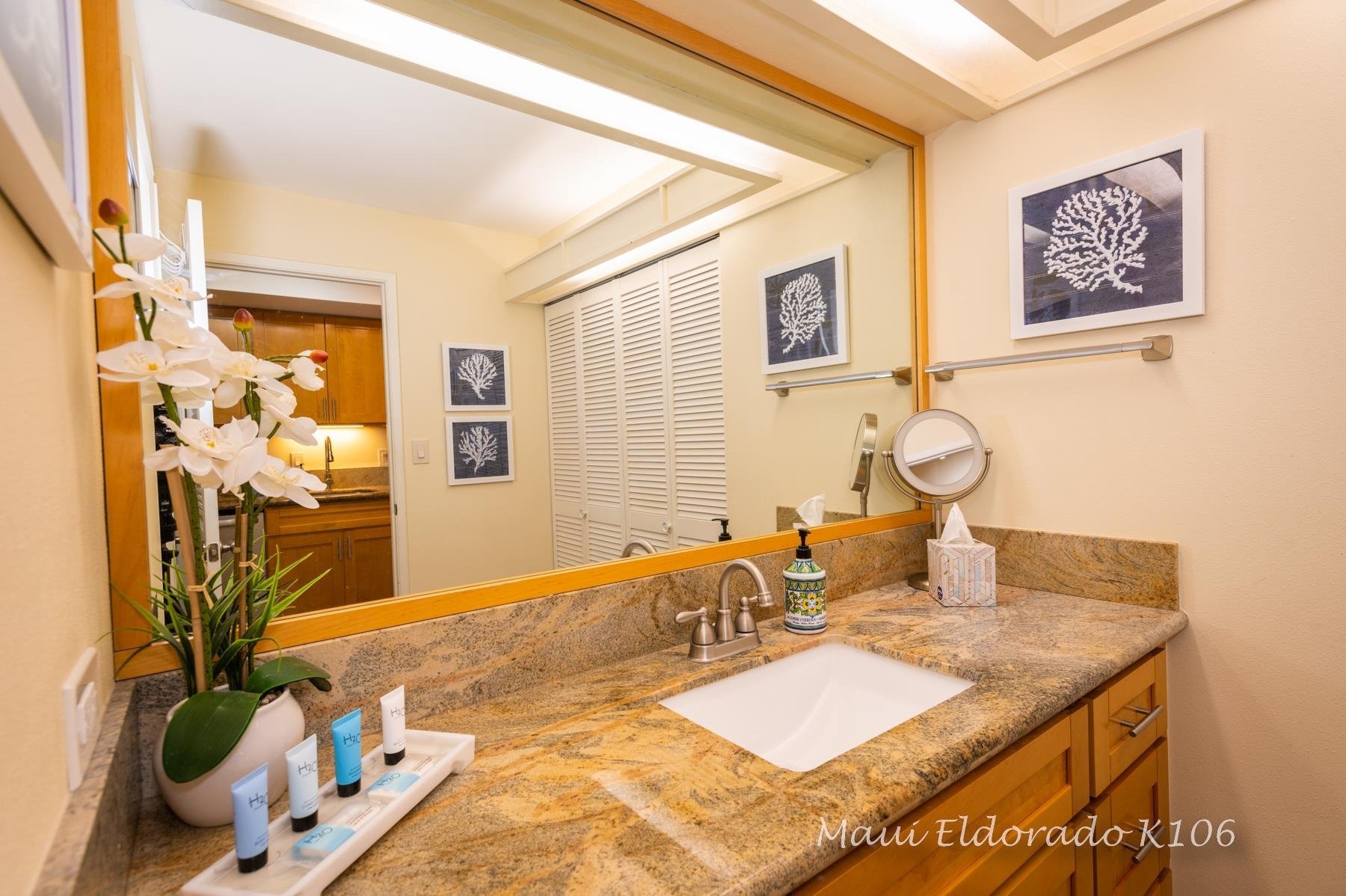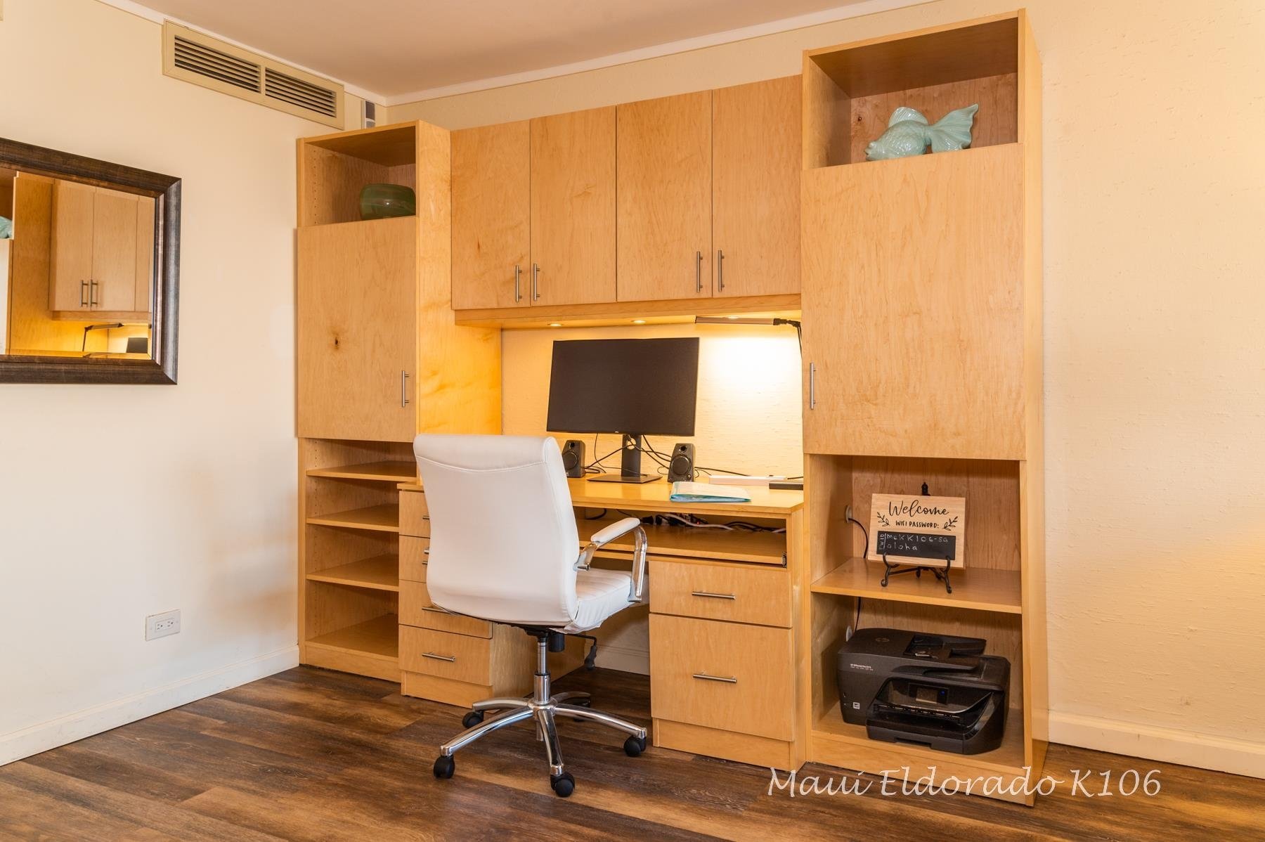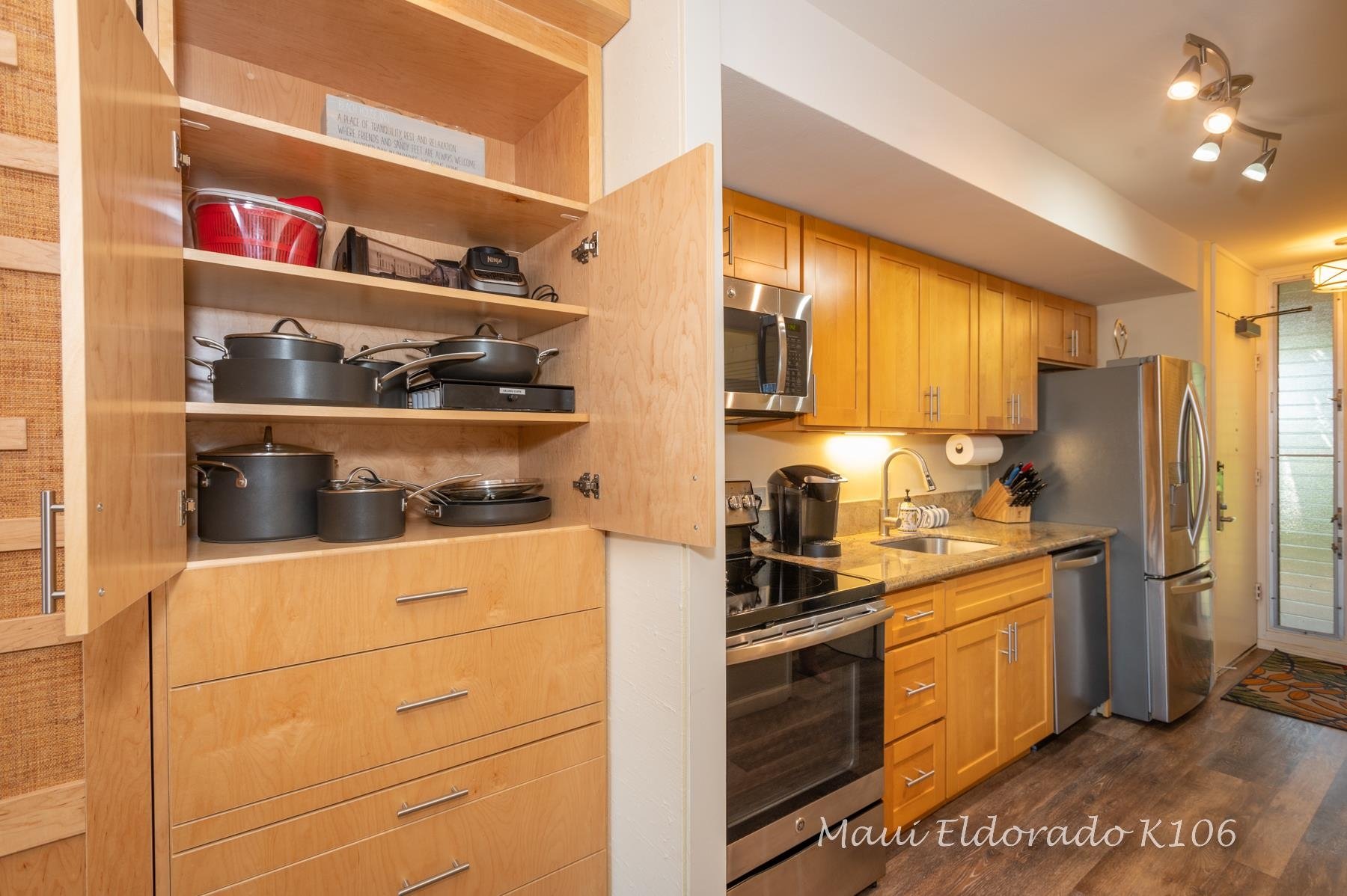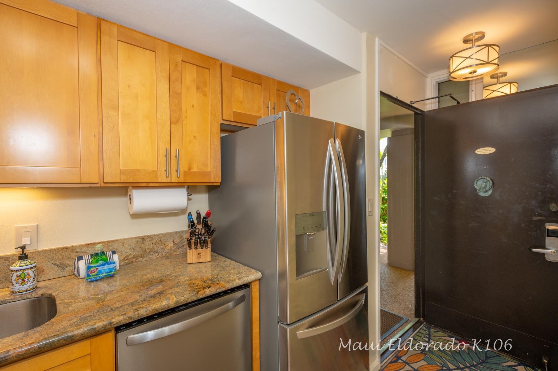 Your turnkey experience at iconic Kaanapali Beach awaits you! This lovely upgraded and updated studio unit at the Maui Eldorado offers a carefree lifestyle in beautiful West Maui or an investment opportunity or both! A kitchen and bathroom renovation was accomplished just a few years ago with granite countertops, stainless steel appliances and gorgeous Cherry Wood Shaker style cabinets throughout. A stylish Murphy bed complements the living space, offering a cozy sleeping area with lots of storage on either side and convenient pull-out night tables. Rounding out the space is an efficient and beautiful desk area, allowing residents and visitors alike their own private space. Other upgrades to this unit include recent replacement of the sliding door unit with an updated unit at a cost of more than $16,000, waterproof and easy to care for vinyl plank flooring, and a dedicated storage closet on the lanai. The condo is being offered fully furnished, including all kitchen appliances, washer/dryer, Murphy Bed, desk unit and seating, dining and lanai furnishings. Recent upgrades total more than $40,000 spent on this fabulous unit. The Maui Eldorado complex offers deluxe living in the heart of Kaanapali Beach. It's close to some of Maui's best shopping and dining as well as famous Kaanapali Beach. Sporting opportunities abound, with tennis, pickleball, hiking and water sports nearby. Included in the monthly maintenance fee are water, cable TV, high speed internet, central air-conditioning, parking garage, 24-hour security, building insurance, sewer, trash and lobby mail service. Maui Eldorado boasts a unique and private beachside Cabana for the exclusive use of owners and guests. Other amenities include pools and hot tub, gas barbque grills, fitness center and shuffleboard. Don't delay viewing this attractively priced unit today! This is a leasehold property.