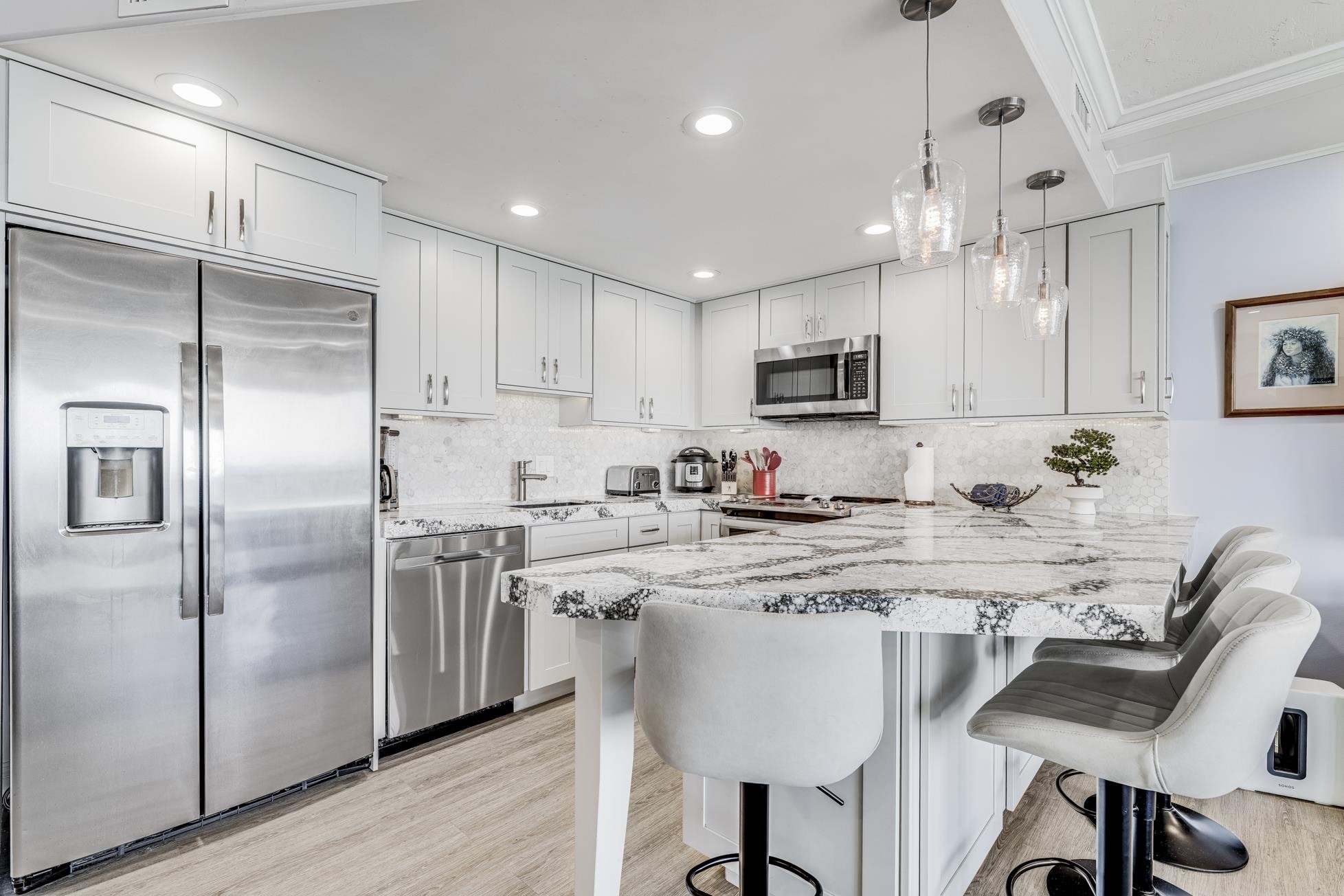 This beautifully remodeled oceanfront one bedroom, one bath condo with over 150 sf of lanai space, immerses you in stunning panoramic ocean views from nearly every angle. Thanks to thoughtfully placed mirrors, the sparkling blue sea seems to surround you wherever you look. Extensively remodeled in 2020 and beyond ~ Enjoy a sleek, modern kitchen with granite countertops, luxury vinyl flooring, and stainless steel appliances, complemented by recessed lighting and new furnishings throughout. Relax in cool comfort with brand new airconditioning and unwind in your tastefully updated bath. The tranquil bedroom with Tempur-pedic king size bed, offers a rare peekaboo mountain view for the perfect finishing touch. Hotel zoned with an impressive rental history and countless 5-star reviews. At Maui Kai 405, every detail is designed to bring the beauty of Maui’s shoreline right into your daily life, making this retreat blissfully unforgettable.