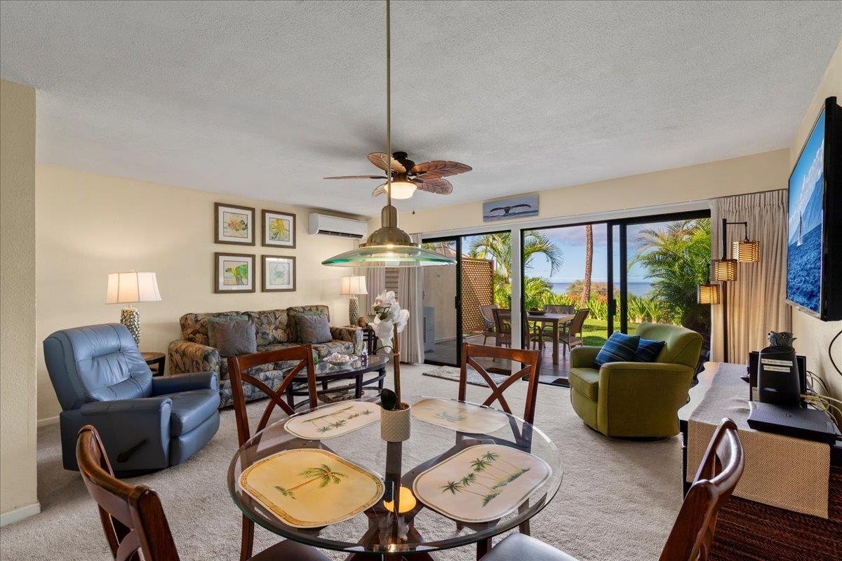 Experience the beauty of Maui from this tastefully remodeled one-bedroom, two-bath oceanview retreat at the highly desirable Maui Kamaole. Step inside and enjoy the spacious, open floor plan with a fully upgraded kitchen featuring new cabinetry, granite countertops, and stylish fixtures. The kitchen flows seamlessly into the dining and living areas, creating a bright and welcoming gathering space. This ground floor condo offers a primary suite with a king sized bed and full ensuite bath, a convenient pull-out sofa bed in the living room, and a second full bath located just off the living area for added convenience. Relax on the private lanai, the perfect spot to enjoy meals or unwind while soaking in views of the Pacific Ocean and majestic sunsets. Whether you’re looking for a vacation home or personal Maui retreat, this unit offers comfort, style, and island charm. Maui Kamaole is known for its lush tropical landscaping, two resort-style pools, hot tubs, tennis courts, and easy access to the white-sand beaches of Kamaole III and Keawakapu. The Shops at Wailea, enchanting boutiques, shopping, dining, and world-class golf are just minutes away.