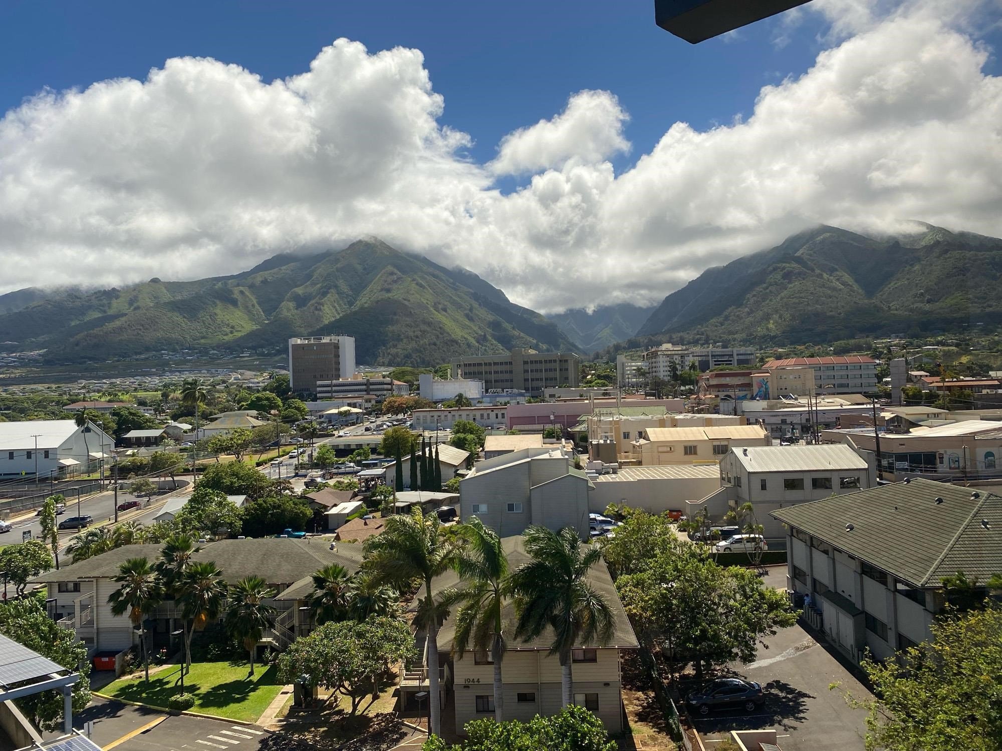 Rare offering Southwest facing penthouse in downtown central Wailuku. Enjoy peaceful and convenient living in this 2bed, 2 bath recently remodeled 6th floor 1,265sqft apartment. Great layout with bedrooms/baths at opposite ends, each with a covered lanai. Master bath and kitchen completely renovated. Bright large living room with 9'4" + vaulted ceiling and gorgeous up-close views of lush green mountains. Big Haleakala view from Master bedroom Lanai and Northshore ocean view from 2nd bedroom lanai. Maui Realty Suites is a secure building with elevators, secure parking structure with two designated parking stalls. Emergency back-up electrical power system, should public power fail, individual storage unit in basement. Building is located across from Wells Park ball field and public tennis courts. Walking distance to shops, multiple restaurants, courthouse, and County and State buildings/offices. Maui Memorial Center is located 3-5 min drive down the road.