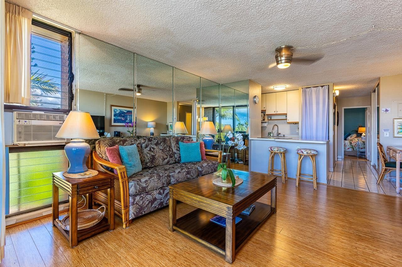 If you're looking for a 5-star reviewed turnkey vacation rental or home that offers beautiful views and a convenient location and steps to the beach, look no further than Maui Vista 1325. This spacious 1-bedroom end unit not only boasts partial ocean views but also provides stunning sunset vistas and majestic West Maui Mountains views. Situated in Kihei, this condo is nestled next to some of the most beautiful beaches in the world, making it an ideal choice for beach lovers. One of the standout features of this unit is its larger size compared to other 1-bedroom condos in the complex. An extra window in the end unit offers a wall of windows to enjoy the views. The deck, which is covered and shaded, can be enjoyed at any time of the day, allowing you to relax and soak in the beautiful surroundings. Recent updates of beautiful stranded bamboo flooring have been installed in the living room and bedroom, adding a touch of elegance to the space. Fresh paint adds a clean and modern feel, while the updated stainless refrigerator and new countertop cooktop provide convenience and functionality. The new under-counter convection/stove oven offers flexibility for preparing meals and a fully stocked kitchen. An updated bathroom completes the stylish and comfortable living space. Additionally, two energy-efficient AC units are installed utilizing end units side windows. Another notable update is the on-demand Stiebel Eltron water heater, which not only saves space but also uses minimal electricity, ensuring efficiency and eco-friendliness. Whether you're seeking a romantic getaway or a relaxing beach retreat, Maui Vista 1325 is ready, completely furnished down to the fork, and ready for occupancy. This condo offers the ideal blend of comfort and beauty with the opportunity to experience all that Kihei and its incredible beaches have to offer. Amenities such as tennis & pickleball and nearby restaurants, shopping, walkways, bus stop with surfing, snorkeling, and all beach activities nearby. Maui No Ka Oi!