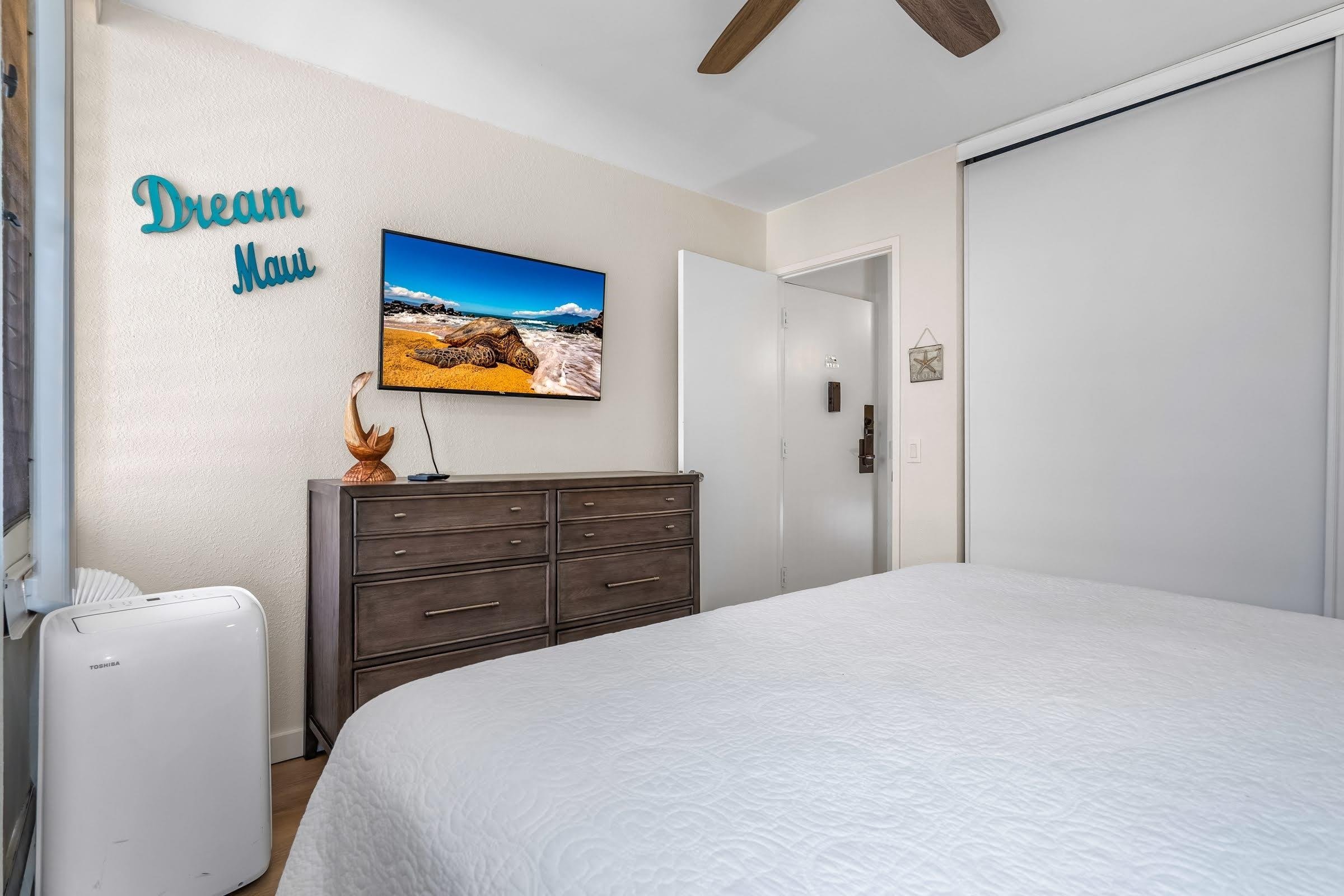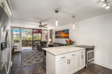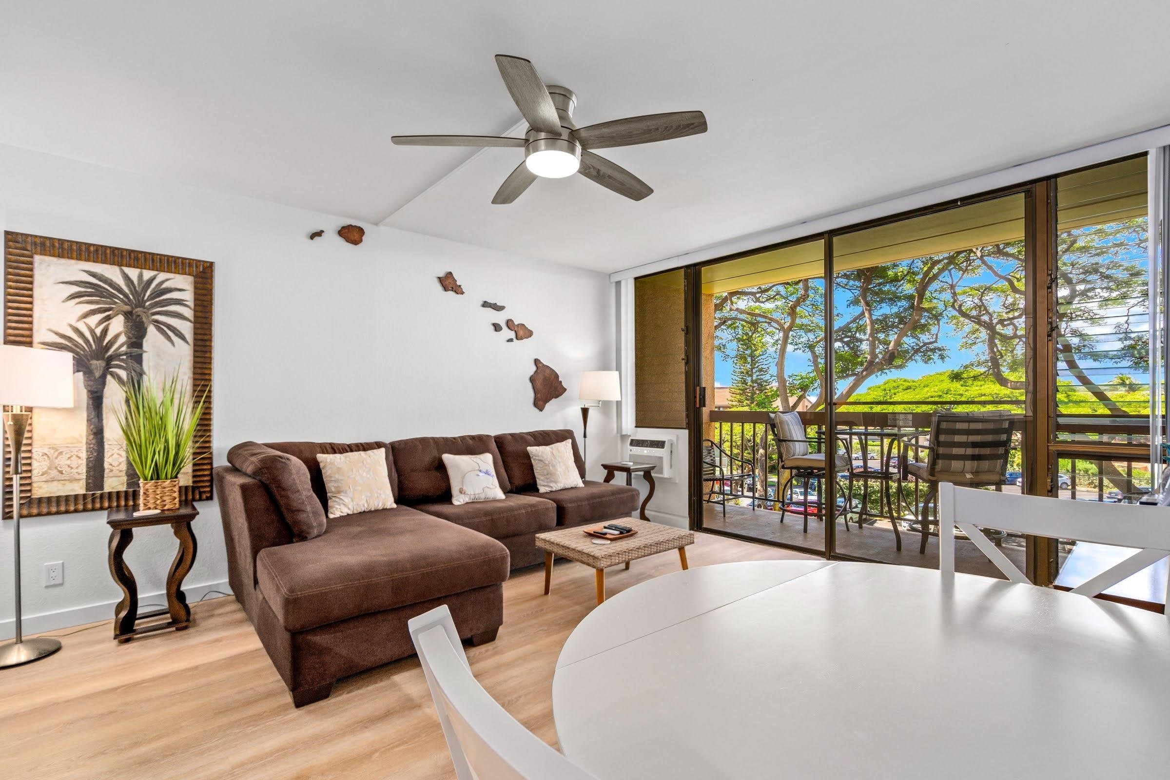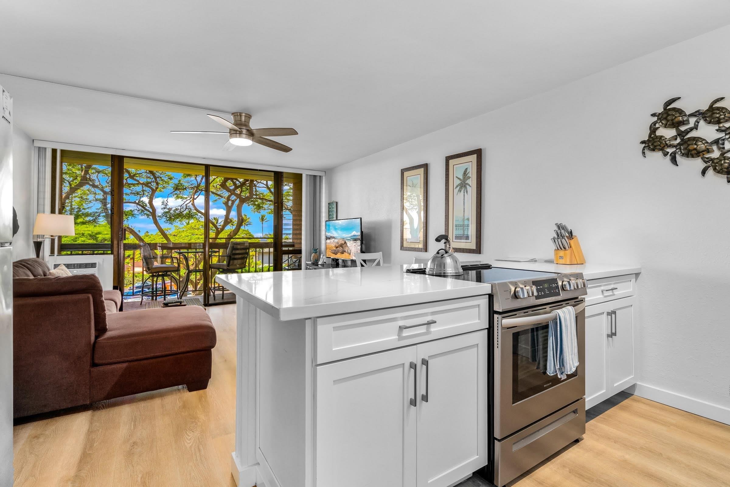 This beautiful, recently fully renovated (2021), one bedroom, one bath is located in well positioned Maui Vista. Across the street from Charley Young Beach and close proximity to many shops and restaurants, this unit is located on the third floor (with elevator access) and the lanai overlooks a lush lawn and tropical plants. The bright and airy interior includes luxury vinyl flooring, fully-equipped kitchen, stainless steel appliances, large island, quartz countertops, soft close cabinet doors & drawers, a coffee nook, washer/dryer, new furniture (including king size bed), new tankless hot water heater, and two AC units! This unit is sold fully furnished and turnkey for vacation rentals including a smart door lock for easy check-ins! Rental occupancy has been consistently over 90%. Maui Vista offers well maintained grounds, 3 swimming pools, multiple BBQ stations, and 6 tennis courts. Do not wait, this is one of the best vacation rental listings in south Maui under $800,000. Call your favorite REALTOR to schedule a private showing today!