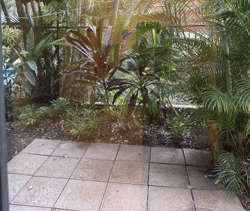 The grounds of the property are oasis-like, surrounded by lush tropical plants. The fence-in backyard area is shaded by trees and features loungers, tables and a barbecue grill for a relaxing retreat.