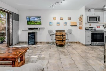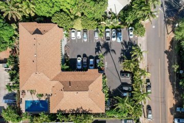 This boutique property houses just 18 one-bedroom units in a two-story L-shaped building. Units range between 523 and 606 square feet. Each comes with a lanai, and those on the second floor boast vaulted ceilings for an airy feel. Condos feature ensuite washers and dryers and many have been upgraded with air conditioning, including split systems.