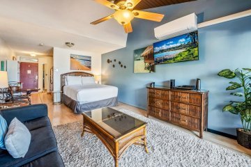Arranged in a U-shape, this boutique complex is divided into seven two-story buildings without elevators. Solar panels on the roofs help reduce energy bills. All units are 445 square feet and include a lanai. Some have air conditioning, a mix of window units and split systems. There is also a shared laundry room on-property.