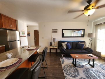 The low-rise complex comprises a two-story concrete building and no elevators. All units span 556 square feet, with views of the gardens or mountains. Ground-level condos boast a roomy patio enclosed by tropical plants while those on the second floor have a Juliet balcony with enough space for a potted herb garden.