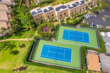 Tree philodendrons, bougainvillea flowers and other lush tropical plants fill the grounds. For convenience, there are two pool areas in the complex, each with a pool, hot tub and barbecue pavilion. The upper pool has an oasis-like feel, with a lava rock waterfall and sand-bottom hot tub, while the lower pool is deeper and ideal for lap swimming. Near the back are two tennis courts.