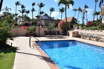 The perfectly manicured courtyard adorned by tropical flowers and palm trees makes Wailana Sands feel like a private oasis. The grassy lawn surrounds the outdoor pool terrace, which is complemented by a barbecue area with two gas grills and tables.