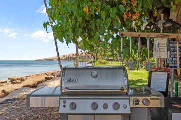 The verdant grounds of Hono Kai feature tropical foliage like hibiscus flowers and plumeria trees. Fronting the beach is an enclosed pool and grassy lawn, both with loungers to enjoy the view. Nearby is a barbecue area with gas grills and tables.