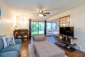 The complex has both fee simple and leasehold properties with expiry set for 2032. It is made up of four three-story buildings without elevators with units ranging between 555 and 805 square feet. Each has a lanai with some ground floor units having a private enclosed patio spacious enough for entertaining. The two-bedrooms boast a lofted bedroom area and high-vaulted ceilings for an airy feel.