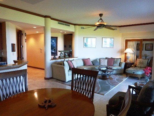 Prime location in Mauna Lani Point! D103has gorgeous views as it directly faces ocean and world famous 15th hole of Mauna Lani South Course. Enjoy view of blue water as soon as you walk in to the living room or sunsets. Completely renovated Mauna Lani Point #D103 has two bedrooms, a media room/office, two full bathrooms and a half bath. It is elegantly furnished with newer kitchen appliances and cabinets. The main bathroom has a large walk in shower and a large tub. This unit offers bonus media room/office next to kitchen.