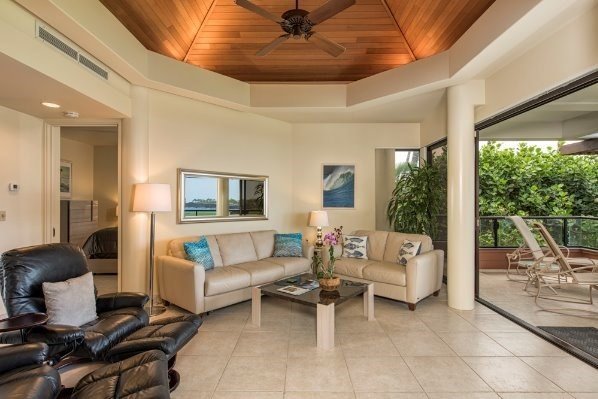 Mauna Lani Point D 206, a penthouse villa, has spectacular ocean, sunset, beach, white water, fairway and mountain views. D 206 has it all. The prime location across from the pool, spa, sauna, pavilion and BBQs of the renovated amenity center and the additional privacy of a top floor, corner-end unit. All the floors have been upgraded with large cool and low maintenance travertine pavers extending onto the spacious covered lanais overlooking the ocean. The renovated kitchen has granite counters and upgraded cabinets. The great room and master bedroom have been expanded for additional interior living. The vaulted wood ceiling and the elegant concrete pillars in the great room create drama, with the exceptional views from the master and great room lanais. Both master and guest bedroom suites are spacious with mahogany shuttered closets.The ceilings are an elegant 9' 3" and the solid concrete construction ensures that the unit remains a quiet and peaceful oasis.Freshly painted and offered with brand new furnishings, this prime oceanfront villa is simply one of the best in this oceanfront community at Mauna Lani Resort. Ownership includes the Advantage Program, offering special rates at the Spa and Fitness Center, the Mauna Lani South and North golf courses and the restaurants at the Mauna Lani Bay Hotel. The Beach Club with its amazing snorkeling, diving, kayaking, whale watching, white sand and oceanfront restaurant is just a few moments away.An exceptional offering of great value in one of Mauna Lani Resort's most treasured oceanfront communities.