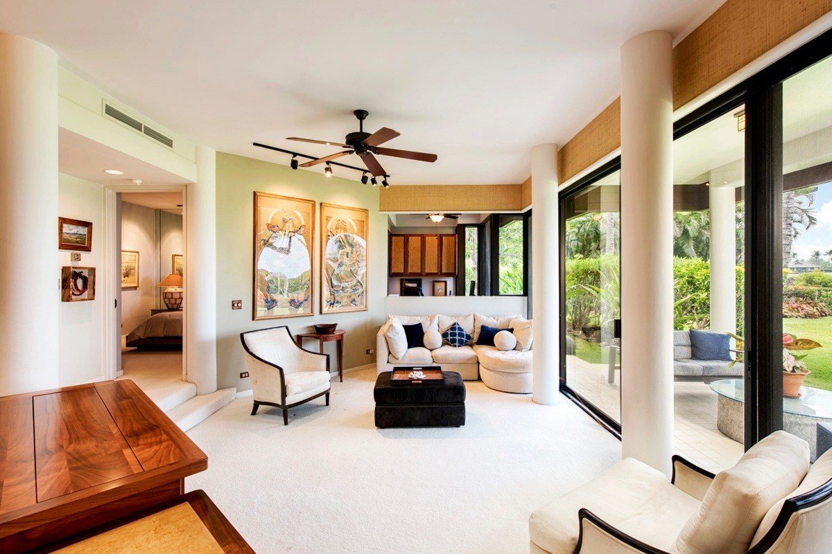 The southwest orientation and the floor-to-ceiling glass doors ensure that the unit is bright and airy all day long. The lush landscaping, private garden, expansive manicured lawns, and sheltered lanai are perfect for relaxing and whale watching. Entertain on the deep lanai and the lawn for stargazing in the cool evenings. The interior custom furnishings from Italy and San Francisco's Kreiss Collection and the outdoor patio furniture by Brown Jordan are included. And it's a short walk along the beautiful Kohala Coast to the Mauna Lani Beach Club with its superb snorkeling, swimming, and paddling.