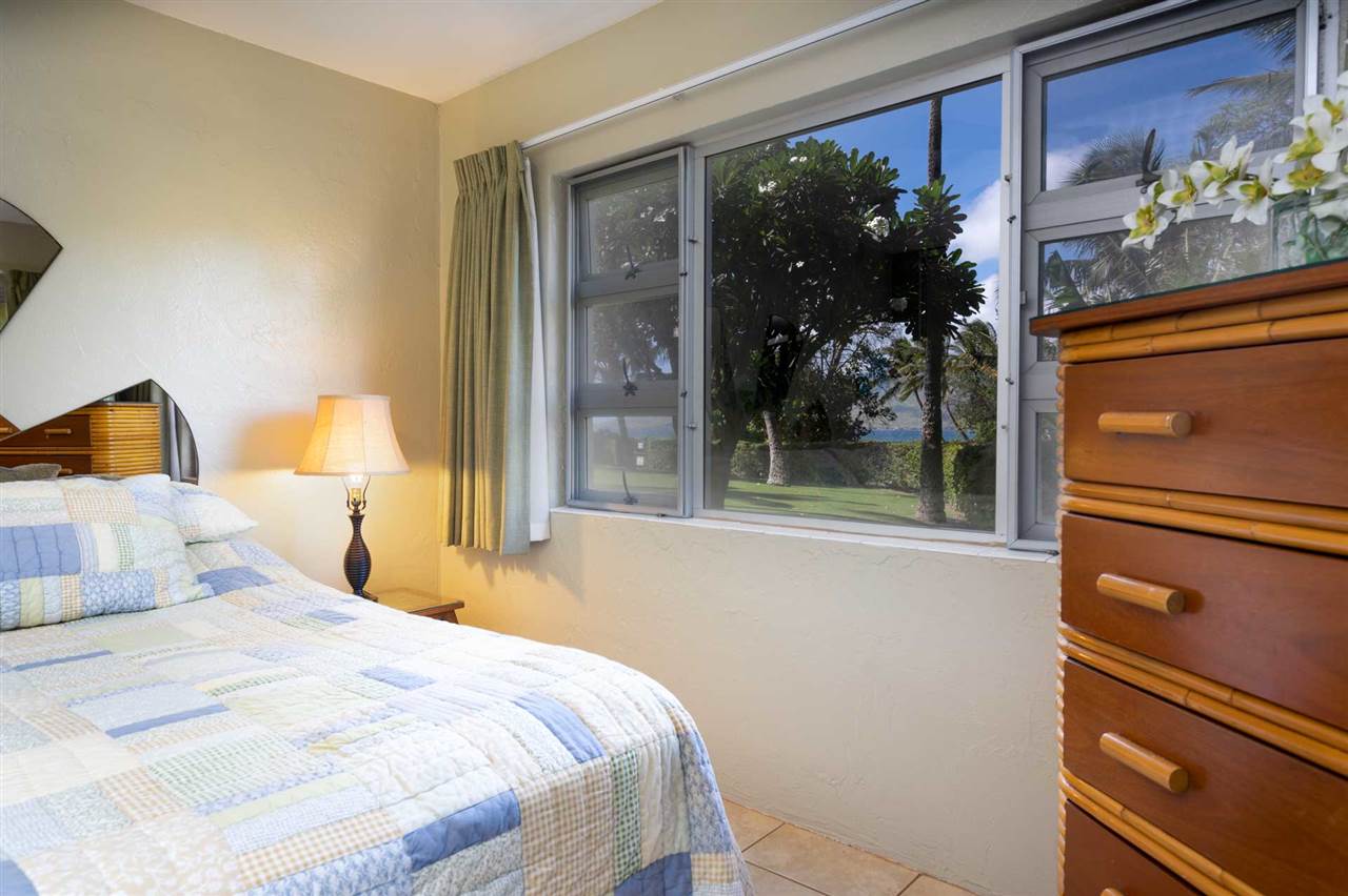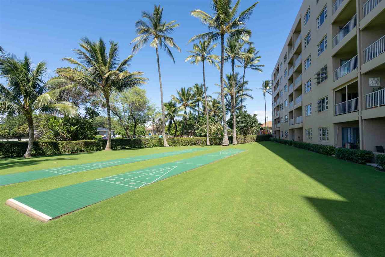 Pacific Ocean and sunset views from your lanai with the wide open space of lawn that leads to the ocean.This unit has been updated and well maintained. Menehune Shores has a lovely roof top entertainnment area, pool, and currently a restaurant on site. Stunning views from the roof-top BBQ area, to watch sunsets and whales breaching. Give me a call today !