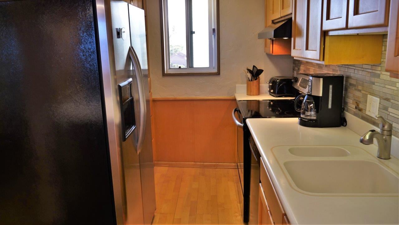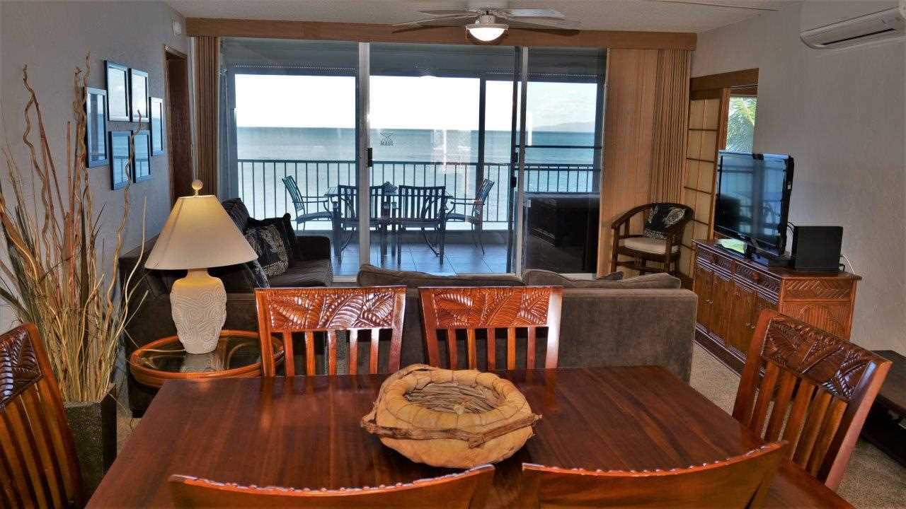 Welcome home to this rarely available 3-bed, 2-bath, fifth floor, direct ocean front, vacation rental condominium at the beautiful Menehune Shores in South Maui. Soothing sounds of ocean waves augment the sweeping panoramic views of the Pacific Ocean, the West Maui Mountains, Lana’i, Kahoolawe, and the Molokini Crater. A paradise awaits! Watch whales in season, sea turtles, wind surfers, outrigger canoes, and spectacular sunsets from the lanai. Excellent snorkeling at the reef beyond the fish pond. This unit has 1,126 square feet of living space with a 126 square foot covered lanai. Beautifully furnished and appointed. The kitchen is fully stocked for all your cooking needs. Sweet dining area with ornate table and chairs, as well as a lit glass display case full of treasures. Comfy sofas in the living room. All three bedrooms are private from each other. Split AC in bedrooms and the living room. Carpet in living room and two bedrooms. Wood flooring in the kitchen, dining area, front bedroom and utility hall. Tile in the bathrooms and on the lanai. Full size washer/dryer. Remote control lanai shutters. Menehune Shores offers a rooftop deck, BBQ areas, elevators, shuffleboard, an oceanfront pool, an oceanfront ancient Hawaiian Fish Pond, the Monsoon Indian restaurant, manicured lawns and sandy beaches just steps from the elevators. All future reservations to be honored.