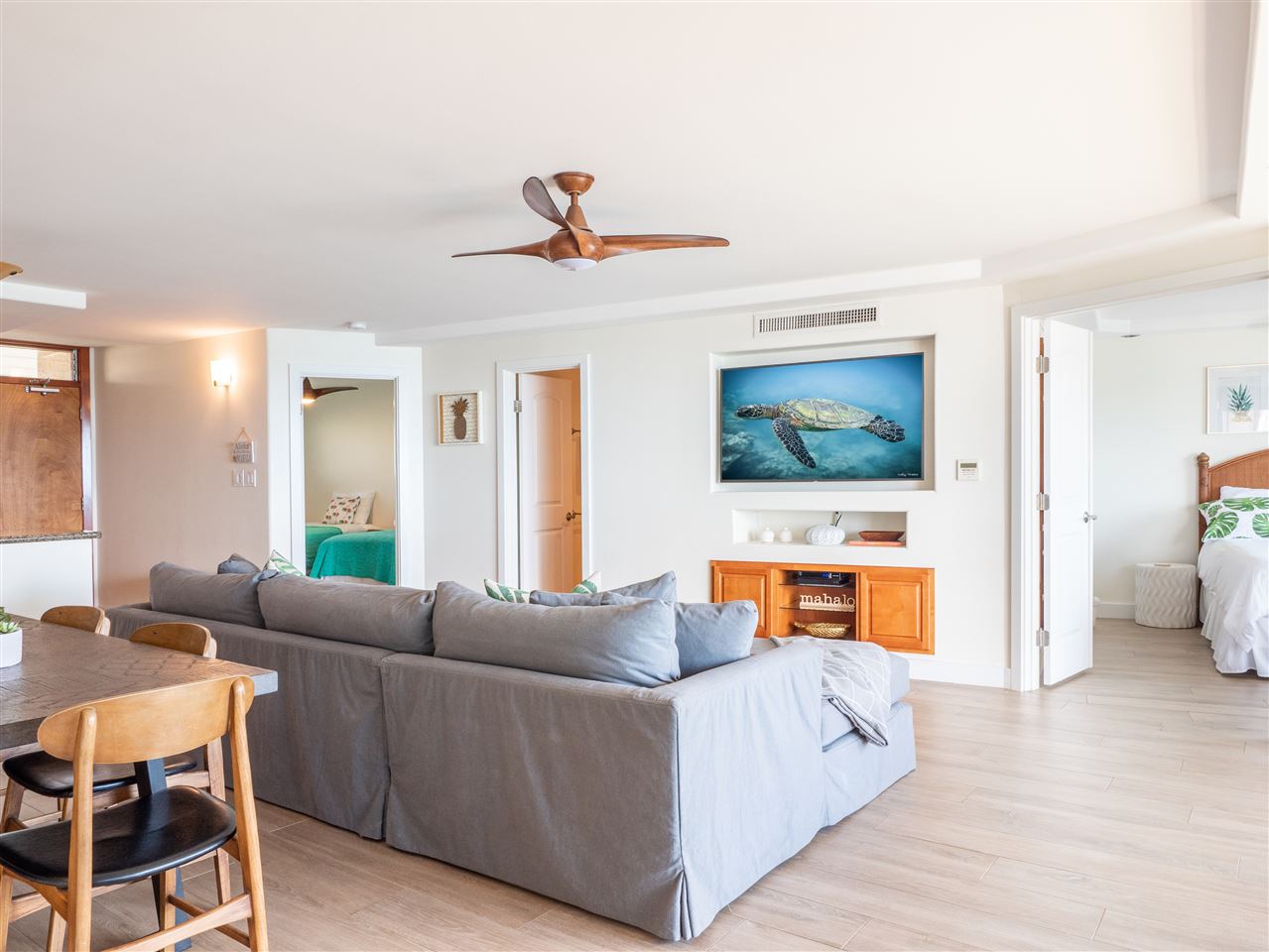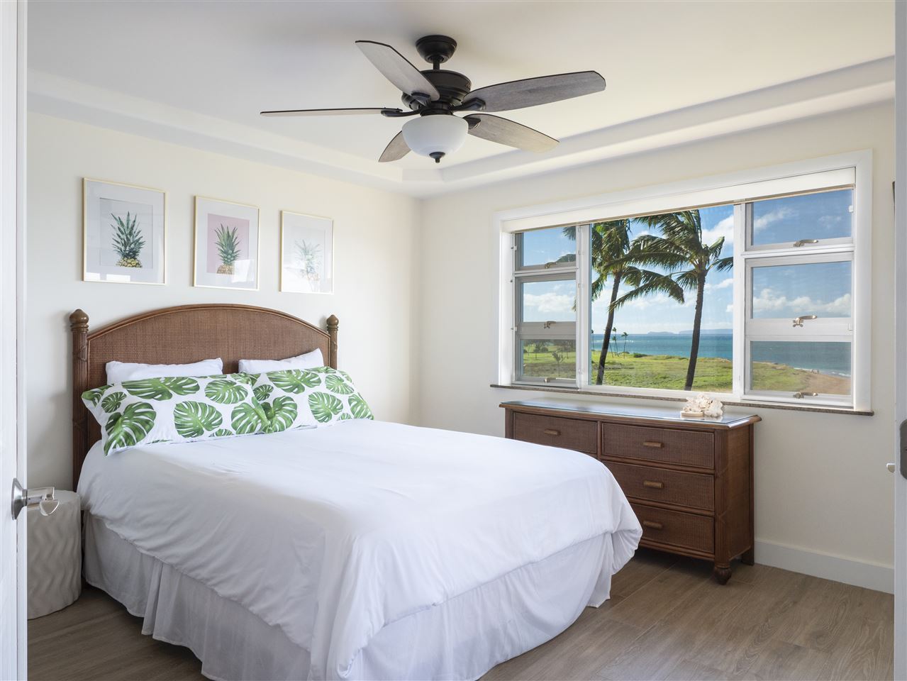 Rare, rare, rare THREE bedroom, OCEANFRONT unit at Menehune Shores, completely remodeled from head to toe. Renovations were initially completed in 2010, with new flooring and close-off ability of the 3rd bedroom in 2018 (formerly a large office space). This fresh, bright, open unit will have you feeling like you are living in the Penthouse, with views across the entire unit. Enjoy your morning coffee with 180 degree ocean views on the large lanai. No stone has been unturned in this immaculate, beautiful, space. The unit features automatic blinds to help reduce sun exposure in the afternoon, a full gourmet kitchen, two beautifully updated bathrooms, 3 large bedrooms, and a huge living area for entertainment. Enjoy the building's pool deck, Shuffleboard court, and Bar-B-Que area as well as the roof deck for even greater views. The unit comes fully furnished and has wonderful rental history and online reviews. This is a must see unit! Call your favorite realtor today to schedule a showing or virtual tour.