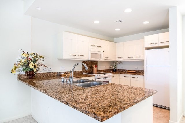 Priced to sell. This is a "fixer upper" as it is mostly original flooring, appliances, etc and being sold unfurnished. Great floor plan that has 3 bedrooms/3baths with a "junior master" bedroom downstairs. The living room is bright and inviting with a vaulted ceiling for an open feeling with lots of windows for light. Kitchen has granite counter tops, soft-close cabinets, and under cabinet lighting plus a built-in buffet in the dining area. This unit offers two lanais with ocean views, one off of the living room where you can BBQ and entertain and a private lanai off of the master bedroom. Master bedroom also has a vaulted ceiling, walk-in closet, and a luxurious master bath room. Central A/C and attached garage are added features. This unit is priced under a recently completed appraisal.Amenities include a pool, children's pool, hot tub and fitness facility. There is a pavilion by the pool with a kitchen, gas grill, and an area for entertaining and social gatherings. The complex is located in the desirable Keauhou Resort just below the Keauhou Shopping Center. Walking distance to restaurants, movie theater, supermarket, drugstore and other shops. It's also close to Kahala'u Beach Park which is a great snorkeling beach and just a few minutes away from downtown Kailua Kona.