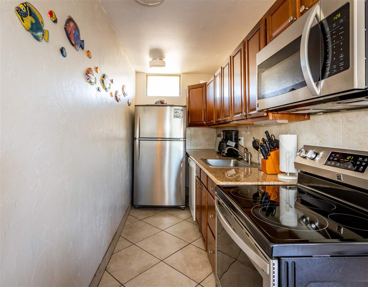 Enjoy the true meaning of paradise with outstanding ocean and West Maui mountain views in your very own beachfront condo on Sugar Beach. The views are accentuated by the mirrored wall & mirrored wardrobe in the living room. This updated unit boasts granite counters, tile back-splash, ceramic tile flooring throughout, and brand new high-end stainless steel appliances. This lovely unit is turnkey and comes fully furnished, ready for your enjoyment. If you’re looking to enjoy time on a white sandy beach or Maui's incredible sunsets, this condo is a must see. This unit also has a lock off feature. Enjoy the recently updated building exterior and common areas at Nani Kai Hale, which were budgeted and thus there will be no increase in Maintenance fees. Contact your favorite Realtor TODAY for a private showing!