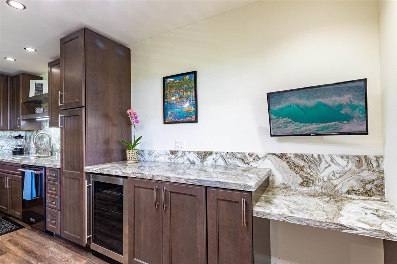 Beautifully remodeled in 2019. This pet friendly condo has vaulted ceilings and two covered lanais, one with an ocean view. Upgrades are the following: In the kitchen there are cherry wood "Kraftmaid" cabinets with pewter pulls, a teak wood island, natural quartzite countertops, "Segue" ceiling fan, high-end "Kitchen Aid" appliances and also includes a beverage refrigerator and washer/dryer. There is superior waterproof HDPC vinyl plank flooring in kitchen and living areas, tile in the second bath and plush carpet in bedrooms. Also, there are custom "Levolor" shutters throughout and a "Fanimation" ceiling fan in the living room. The bathroom has a bamboo vanity with natural quartzite counter and porcelain sink. The dining area has a computer work station with wall mounted monitor. A wall mounted television is included in the second Bedroom. Unit has a wall AC in the living room, and an ensuite master bedroom that includes a walk in closet. There are two dedicated parking spots and an outdoor storage closet. This area has wonderful trade winds to keep the temperature just right. Nearby you will find great beaches and amenities such as the Napili Market, restaurants, a café and more. Also, Maui Prep Academy is just across the highway. This condo-home has so many thoughtful details, ask your favorite Realtor to tour this beautiful property and see for yourself.
