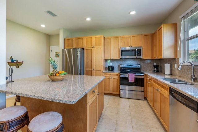 As you step inside, you are greeted by an open-concept living space that seamlessly connects the living, dining, and kitchen areas, perfect for entertaining or relaxing after a day of exploring the island. The kitchen features updated appliances, a large island, and ample storage space. A wrap-around, covered patio off of the living area invites you to have al fresco meals while taking in the tropical gardens surrounding the condo. At Nihilani, one also has access to a tropical-style swimming pool with a waterfall, hot tub, and BBQ pavilion, all perfect for enjoying the beautiful outdoors.