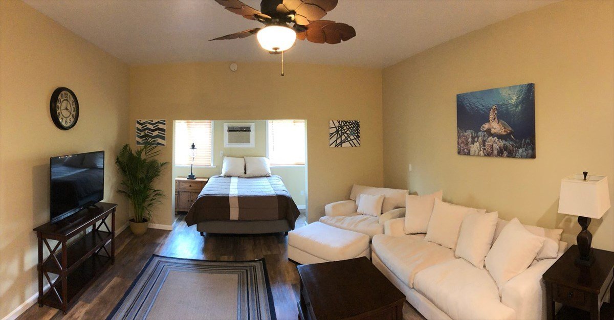 Beautifully upgraded studio condo located in the heart of downtown Hilo on Reed's Bay. Centrally located only one mile to Banyan Drive and Hilo Bayfront; and on the way to Keaukaha.This ground floor condo is sold fully furnished and newly remodeled. All new stainless steel Kenmore appliances with a 5 burner stove and brand new cabinets with lots of storage. There is breakfast bar seating that separates the kitchen from living area with all new quartz countertops. All new plumbing valves, sinks, shower and garbage disposal. Also, the new drywall hides the cinder block wall and encloses the lanai. This unit also features brand new Lifeproof vinyl plank flooring.The outer door to the complex is locked and entry is only accessible with a key. In the back of the Orchid Manor complex is a pool that overlooks the ocean with a grassy area by the parking area and bay. Plate lunch restaurant in the lobby too!Maintenance Fees include: resident manager, electricity, water, gas, sewer, trash and maintenance of the common areas. Orchid Manor AOAO has purchased the master lease of this property and becomes fee simple Dec. 2025