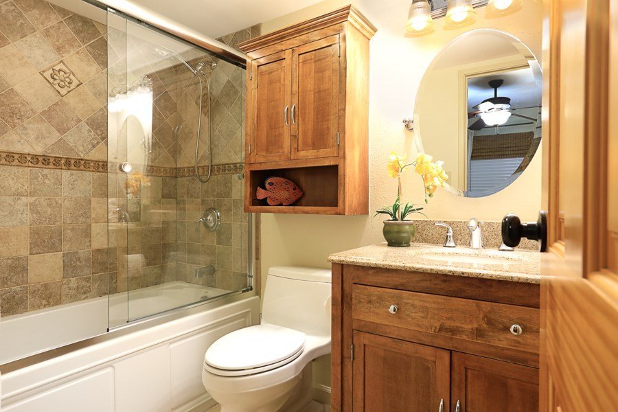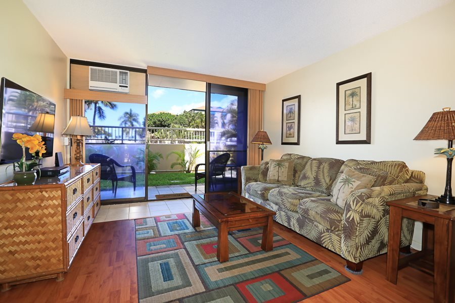 Pacific Shores is a lovely condominium that allows vacation rentals located directly across South Kihei Rd. from Kihei’s revered Kamaole Beach Park One. Unit B-105 is a beautifully renovated 2 bedroom, 2 full bath, 745 s.f. ground floor unit with excellent rental history. Upon entering you experience the warmth of the richly textured wood-laminate floors. There are granite counters complimenting the lovely wood cabinets in the fully equipped kitchen. The black and stainless steel appliances create an elegant kitchen environment. The tall sliding glass walls in the living room open to a tiled exterior lanai & grassy yard area. The master bedroom is spacious & accommodates a king size bed & large dresser. The en-suite master bathroom features a granite top vanity with under-mount porcelain sink & travertine-like porcelain shower tiles set in a decorative pattern that extends up to the ceiling. The guest bedroom & its adjacent bathroom are equally elegant.The travertine-like porcelain tiles are juxtaposed with a river-stone shower base & wall detail which is framed by the black-anodized aluminum shower enclosure & accented with little ‘honu’, (turtles)! Just outside the front door is a lushly landscaped two-story center courtyard. Pac Shores features a lovely tiled pool & spa area. Restaurants, shops, local entertainment, fabulous golf & tennis facilities & almost every imaginable amenity are close by. Unit B-105 comes with two deeded dedicated parking spaces. This lovely unit is move-in ready! Pacific Shores is a treasured Central Kihei property.