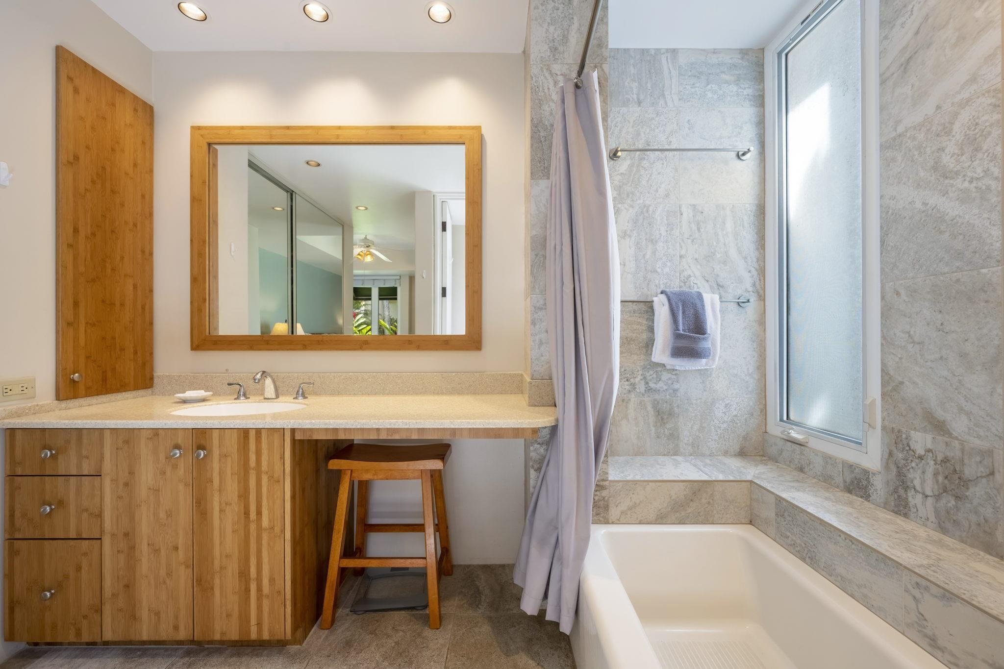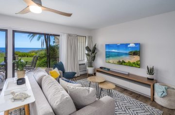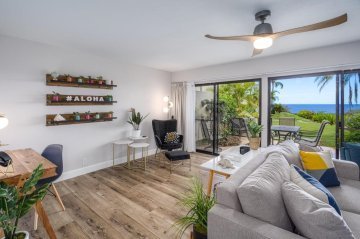 Palms at Wailea is one of the best destinations in the resort area of Wailea. It's the perfect location; close to shops, restaurants, spas, golf and beaches. This large 1 bedroom, 2 bath ground floor unit is both bright and spacious with many paths leading out to the tiled lanai and grassy yard access. The inner courtyard location is most relaxing with close access to the pool/spa area. The floor plan is generous and open which gives it a feel larger than it is on paper. Porcelain tile floors are throughout the unit which makes the space visually consistent and a step down dining/living area and kitchen gives a sense of separation from the bedroom and baths. The kitchen has a pass through window to the patio for easy entertaining. Stainless steel appliances, recessed lighting, newer split A/C unit, upgraded main bath tile and tub and a newer custom ordered pull out queen sized sofa/sleeper are some upgrades worth mentioning. The unit is listed in a vacation rental program and all furnishings, linens and supplies are included in the sale.