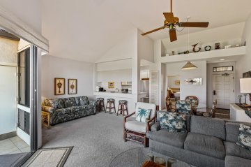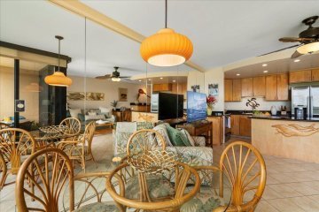 Owners and Visitors to the Palms of Wailea understand why this Resort is a favorite... solid concrete construction, spacious interiors, well managed low density Resort perched on a Bluff within a short walk to the famed Wailea Resort shoreline and upscale Shops and Restaurants. Palms 406 is all of the above and also boast new flooring, fresh coat of paint, new furnishings, fixtures and appliances. Combine that with added A/C in the Great Room, the privacy on the second floor with a lanai that is both open and covered where one can enjoy Preferred Resort Views, Sunsets and Night Skies with a bonus partial Ocean View. With all these Attributes in place, the Buyer of Palms at Wailea 406 will find great value at this price... Privacy, Preferred Views and desirable Location in this self managed popular Vacation Rental property.
