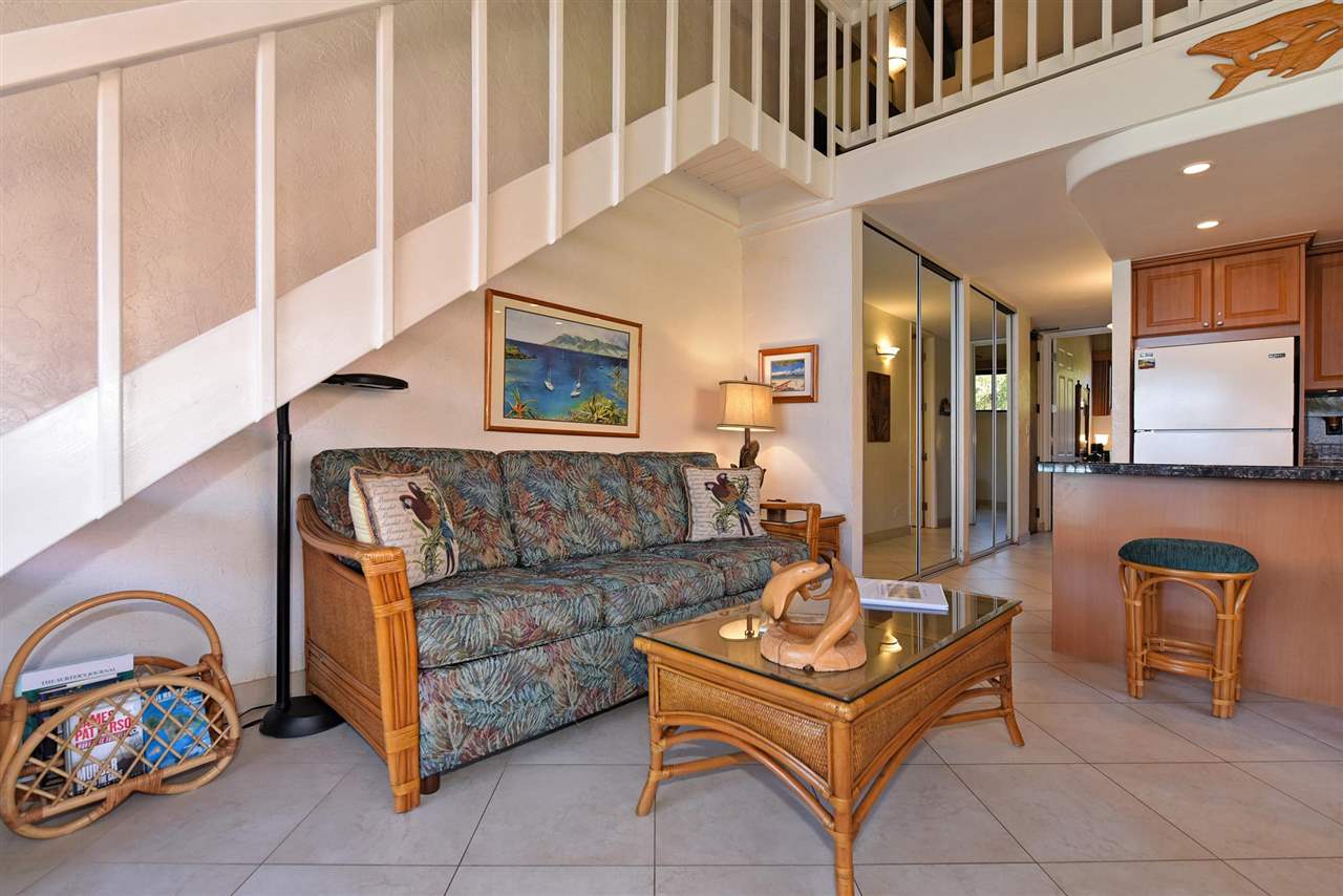 Papakea K401 has stunning views from this spacious, open corner end unit closest to the ocean. Located less than 50 yards from the ocean, makes this beautifully decorated and remodeled unit almost oceanfront. It is a top floor two-bedroom loft style unit. The 4th floor features soaring wood cathedral ceilings that rise up to the loft making this unit feel very spacious. The kitchen, living room and lanai all have beautiful views of the resort and ocean. The K building is very desirable because it shelters the lanai and living room from the afternoon sun. K-401 has been continuously updated and improved. The 2019 $60,243.00 remodel included a new lanai door/window wall. Both bathroom showers received stunning new tiles and plumbing. The cabinet doors, hinges, turtle knobs and drawer fronts in the entire unit were replaced. New tile floors, lights and art were added to the loft bath. The loft also received 6 panel doors, a wall mirror and tropical style light sconce. The entire first floor has tile and granite countertops in the kitchen and bathroom. In 2020 a $12,000 top-of-the-line Fujitsu with 3 independently controlled air handlers and timers in the living room/kitchen, loft and master bedrooms. Situated on 13 tropical acres the amenities include 2 ocean-side swimming pools, 2 whirlpool spas, 2 tennis courts, 2 oceanside cabanas, 2 pickleball courts, 2 twelve-hole putting greens, 24-hour front desk service, and ample parking. Within minutes to Duke’s restaurant, shopping center, Farmers Market, coffee shops, sandy beaches, snorkeling and surf. Papakea is conveniently located between the Kaanapali and Kapalua world-class golf resorts, just minutes away from shops, restaurants and galleries in nearby Lahaina and Whaler’s Village. Walk to the grocery store, delis and other services on the other side of Papakea and right across the street.