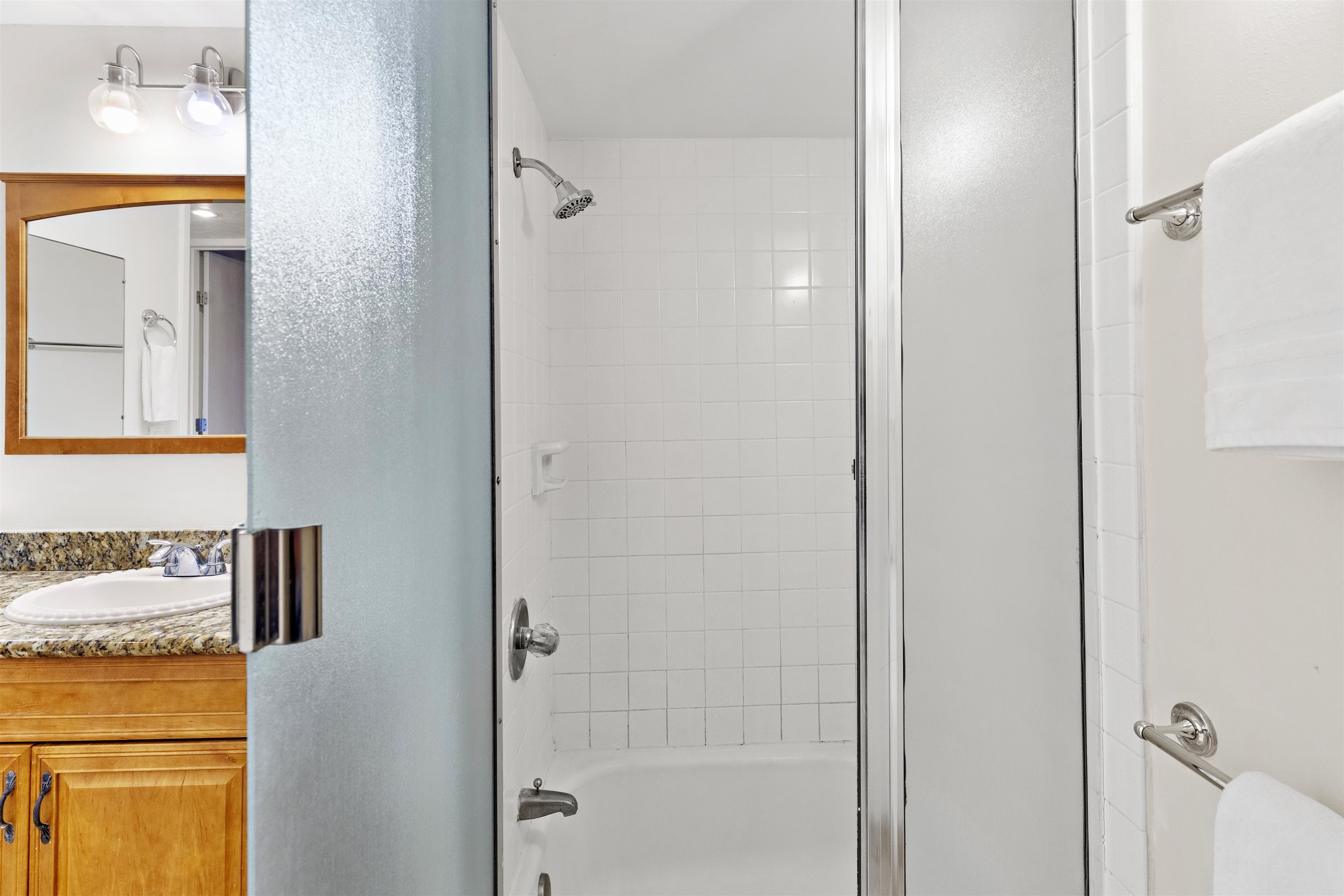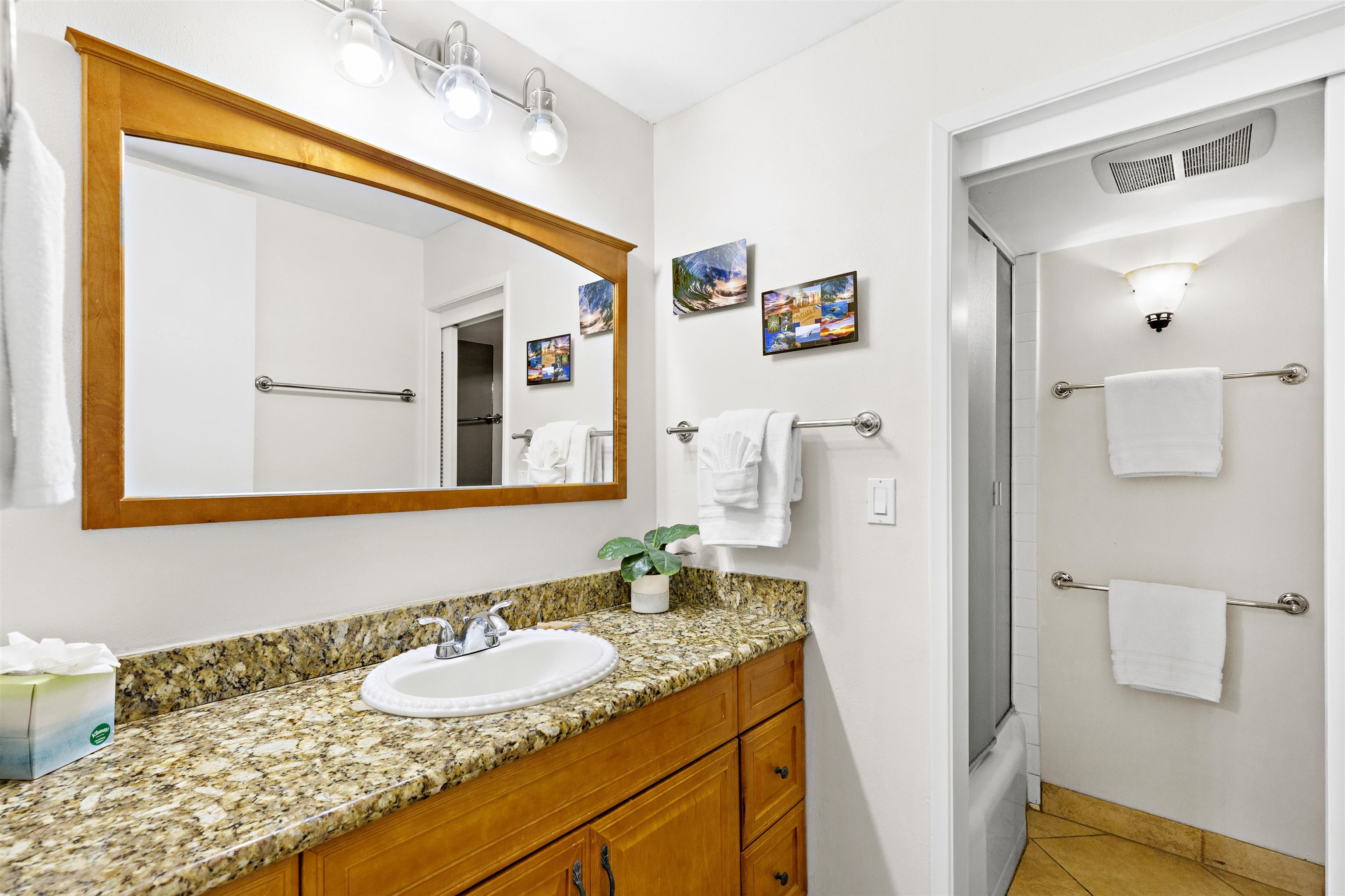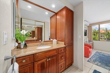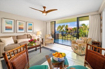 Escape to tropical bliss in unit K-402, a stunning 3-bedroom, 2.5-bathroom top floor condo where paradise comes to life the moment you step through the door. The living room, kitchen, and primary bedroom all feature stunning ocean and Molokai views. Relax on your shaded lanai in the afternoons, overlooking the lovely grounds, pool and barbecue area below. Vibrant tropical hues welcome you into this beautifully furnished retreat, thoughtfully designed to capture the essence of island living, including a one of a kind resin top coffee table commissioned from local artist Cathleen McCandless.This well-designed condo features 2 bedrooms and 2 full baths on the main floor, plus a spacious 249 sq ft loft with vaulted ceilings that serves as a third bedroom with a half bath and closet. The open-concept living area showcases tile floors and vaulted ceilings that create an atmosphere of spacious tranquility, while the split AC system and ceiling fans ensure perfect comfort regardless of the season. The kitchen showcases gleaming stainless steel appliances and granite countertops with convenient counter seating for three. Host memorable island dinners at the adjacent dining area, which comfortably accommodates six guests. Discover charming details throughout, including a whimsical under-the-sea mural painted by local artist Jordan Keahi, tucked away in a cozy nook beneath the stairway. Enjoy all the comforts of home with the included washer and dryer, making beach days and extended stays effortless. Your perfect Maui getaway awaits in unit K-402 - where luxury meets island charm in a setting designed for creating unforgettable memories.