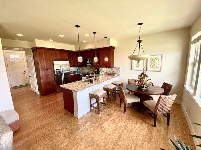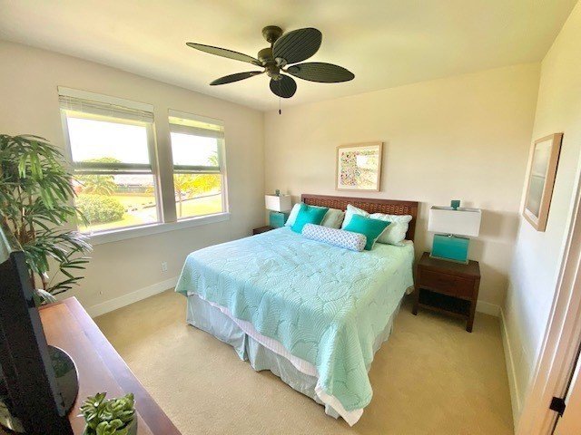 This villa was used as the developer's model home. Custom furniture and décor that accentuates this beautiful space. The Hohonu, Plan 7, is a second floor Split level, two bedroom, two bath at the center of the building. Only 2 bedroom that is on the second floor and that offers a bonus room upstairs. It can be used as an entertainment room, or for guests. A love of nature and a natural color palette are reflected in the home.
