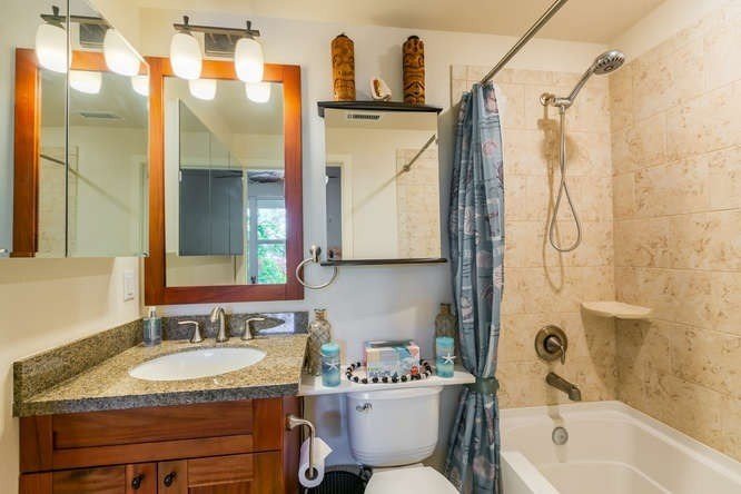 Owner upgrades include: Ceiling fans installed in living area and bedrooms Patios painted with a concrete deck coating to match the infamous Kauai red dirt Additional storage added to garage and bathrooms Barn door added to second guest room closet which adds to functionality of space Additional fridge in garage LED lighting throughout Two King size beds