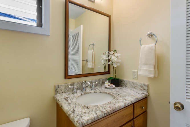 Welcome to Unit 411 at Poipu Sands, one of the most prestigious beach resorts on Kauai’s sunny South Shore. You just won’t find a unit as private as this 1 bedroom, 1.5 bath condominium! With nearly 1,000 sq. ft. this spacious condo is incredibly unique and tranquil, as it is the only 1 bedroom, ground floor end-unit in Poipu Sands with no condo above or below it. Experience gentle sea breezes, the sound of the surf, and enchanting ocean views from the tiled lanai, which opens to an impeccably-landscaped greenbelt. This spacious condo has a washer/dryer, completely remodeled kitchen and bathrooms with granite counters, stainless steel appliances, custom cabinets, and refurbished upscale amenities throughout. The master bathroom features double sinks and a gorgeous travertine tiled bath/shower.The living room’s Murphy Bed and half bath is perfect for guests. Sleeping four people comfortably, the condo is a successful vacation rental with future bookings that can be passed along to the new owners. This luxury condo is well off the road and the perfect distance to the private tennis court, BBQ areas, and large, heated resort pool. Just steps away from Shipwrecks Beach, Poipu Sands is also adjacent to the Grand Hyatt Kauai Resort & Spa. Poipu Kai resort amenities include a world-class tennis complex, miles of walking paths, 24 hour security and more. Conveniently located close to all the shopping, dining, golf courses and attractions that Poipu Beach has to offer.To virtually walk through the unit copy and paste this link into a new browser window: https://player.vimeo.com/video/714328029?h=264243c420