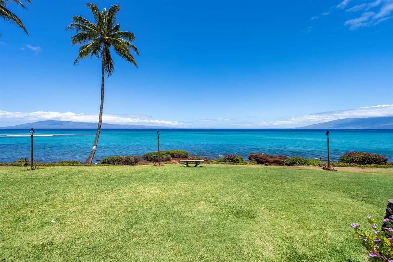 The Polynesian Shores in Kahana is an oceanfront community, the nearest residences only about 20 yards from the ocean. The three buildings are laid out in a V-shape, with the base on the inland side and the two sides extending toward the coastline.
